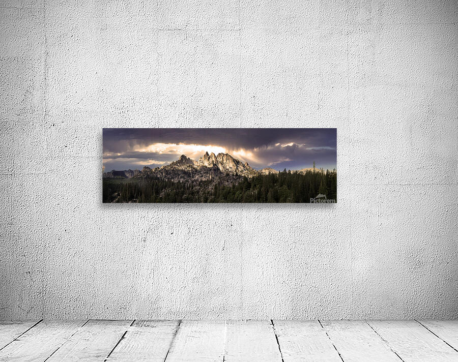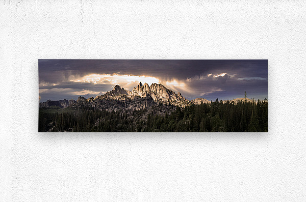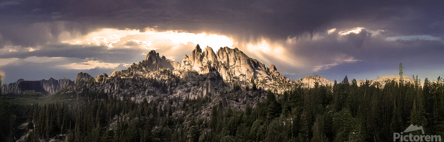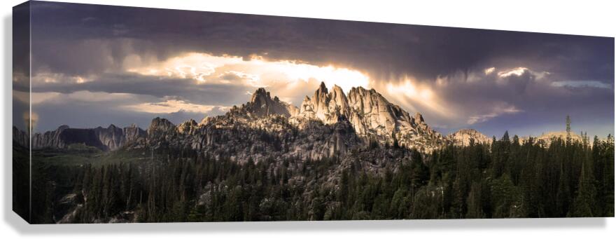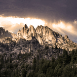 The majestic mountain peaks of Northern California's Castle Crags rise dramatically above a dense forest, with light streaming through the clouds ...[+]