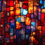 Immerse yourself in the beauty of this mesmerizing stained glass design, featuring a vivid mosaic of bold colors and intricate geometric shapes. Rich hues of red, purple, orange, and blue blend harmoniously, highlighted by textured glass and black metal leading. Perfectly capturing the essence of illuminated artistry, this radiant design evokes warmth and elegance, making it ideal for artistic inspiration, decor, or creative projects.