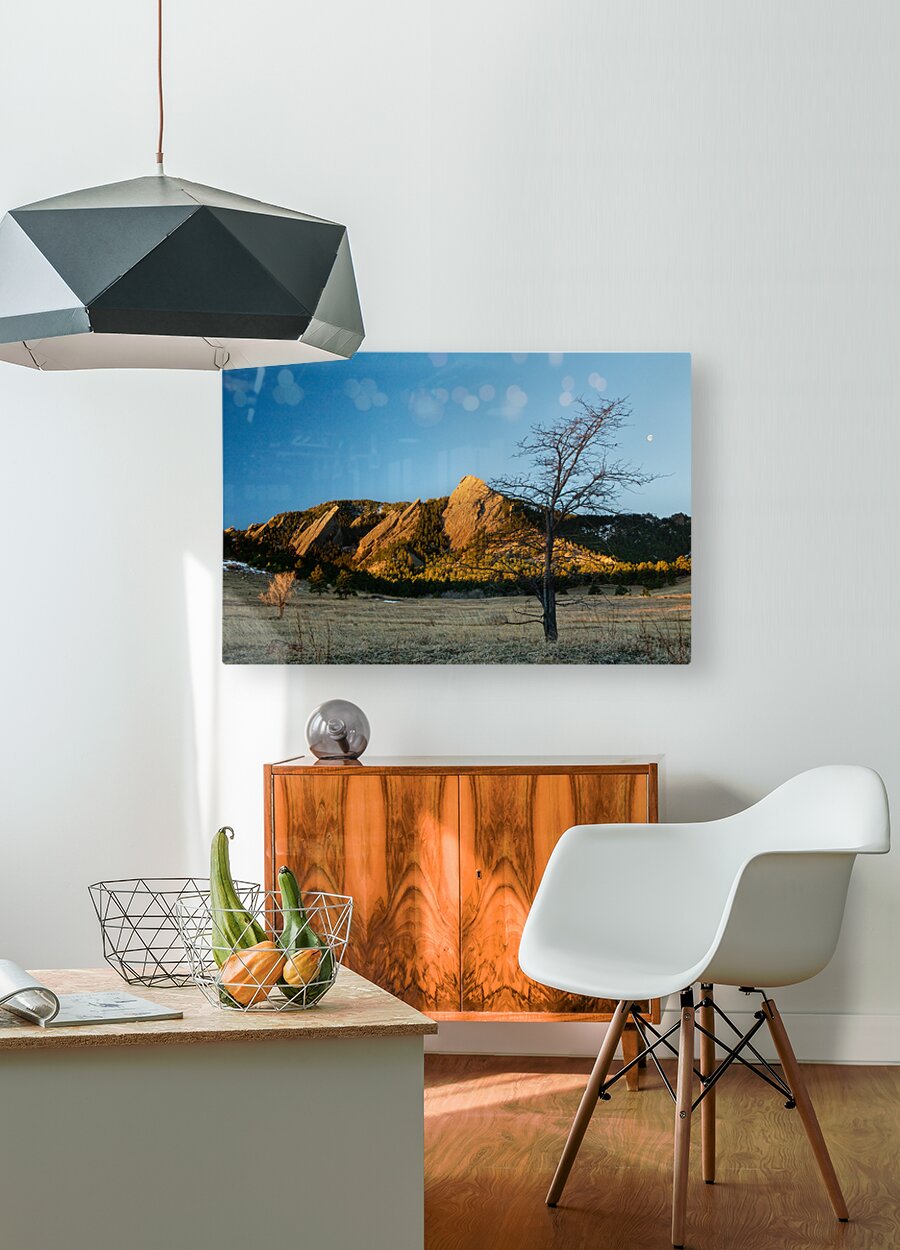 Scenic landscape view of the Flatirons on the front range in Boulder Colorado as the sun is rising and the waning gibbous moon is setting behind the Colorado Rocky Mountains. Colorado fine art nature landscape photography poster prints decorative canvas prints acrylic prints metal prints corporate artwork greeting cards and stock images by James Bo Insogna C - All Rights Reserved. Please feel Free to share our links with Family or Friends who may also enjoy them. If you like my Art Gallery please spread the word and press the Pinterest FB Google+ Twitter or SU Buttons! Thank you! *PLEASE NOTE WATERMARKS WILL NOT BE ON THE PURCHASE PRINTS*
