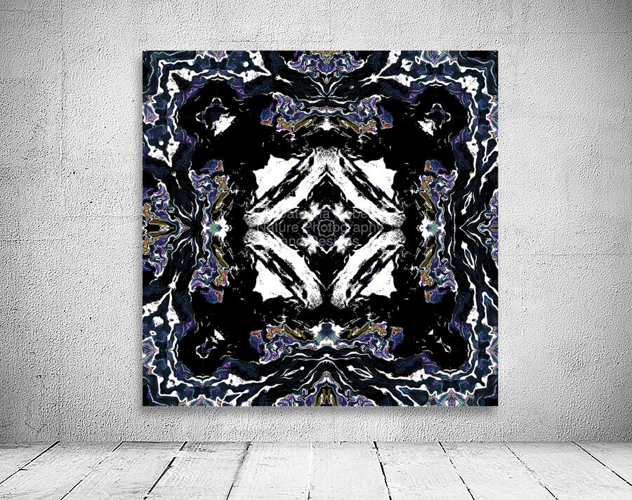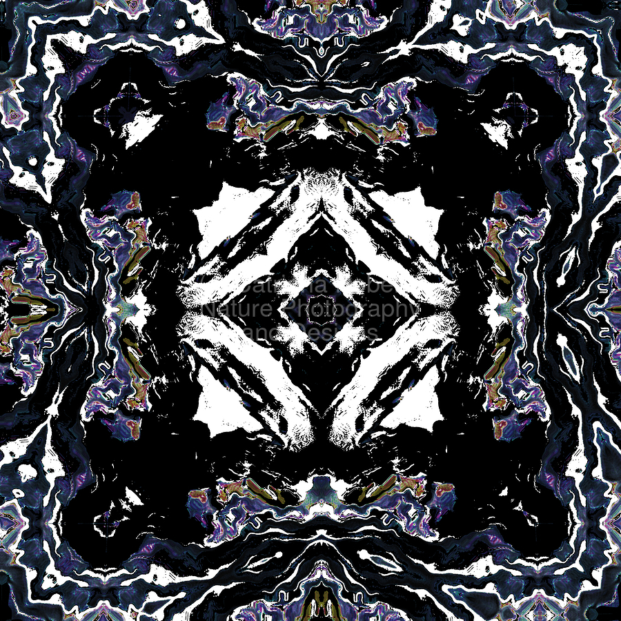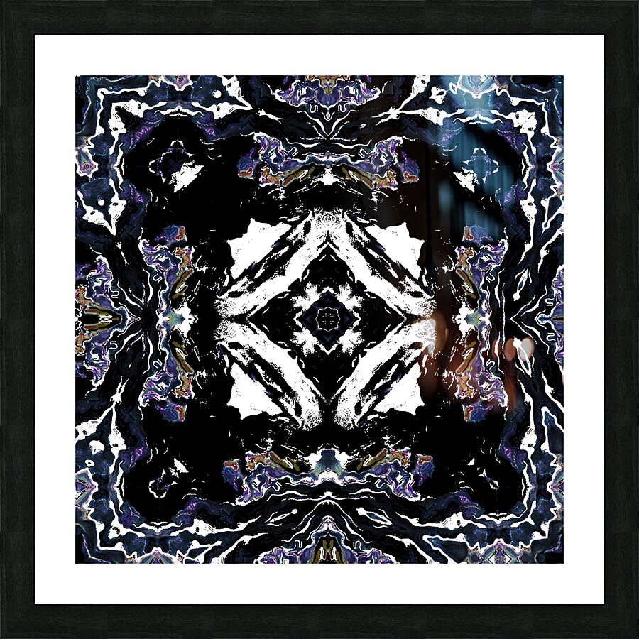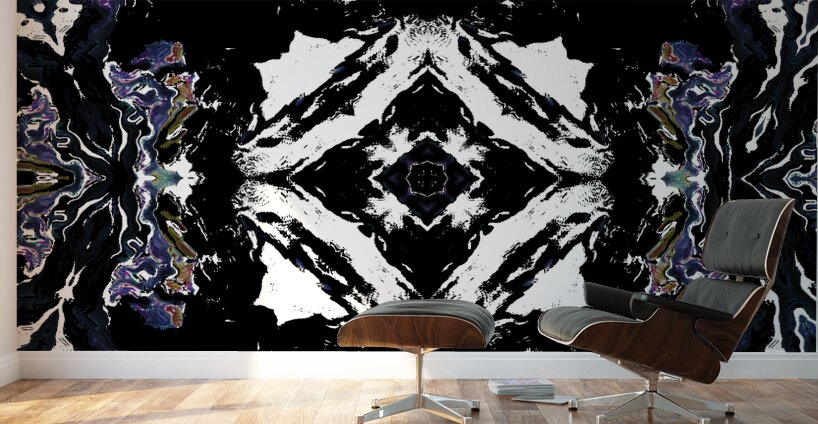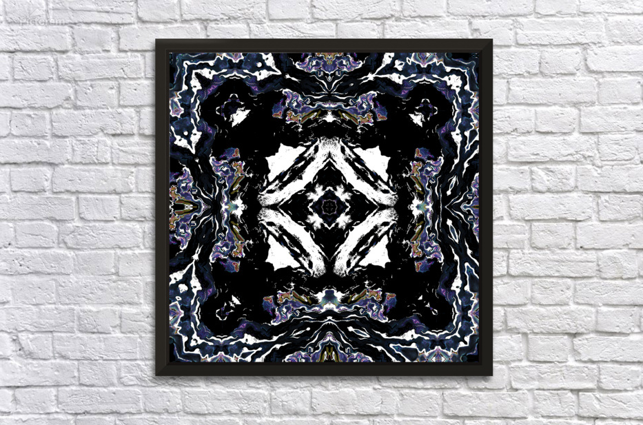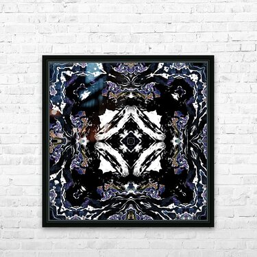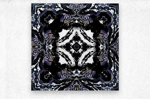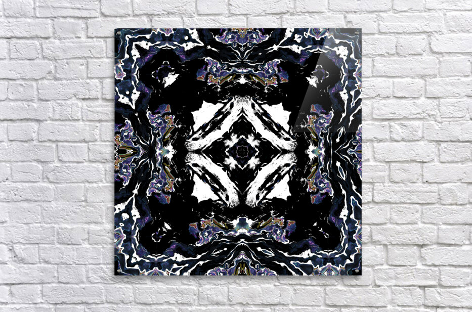 Originally a hand painted acrylic laterally digitally manipulated (using various means including repper.com) into a stunning piece of contemporary abstract art. An intricate kaleidoscopic pattern is formed by swirling lines and mirrored shapes in black, white, and hints of purple and blue. The symmetrical design creates a visually engaging and complex motif.