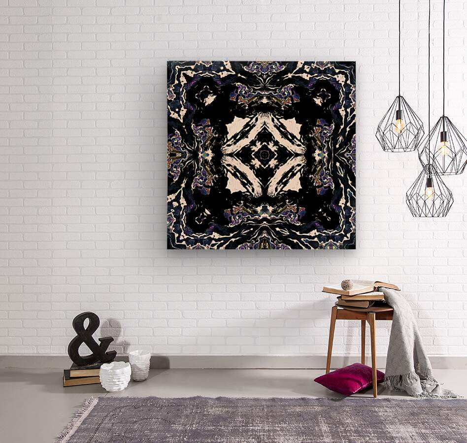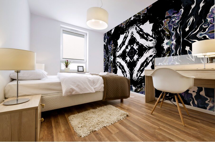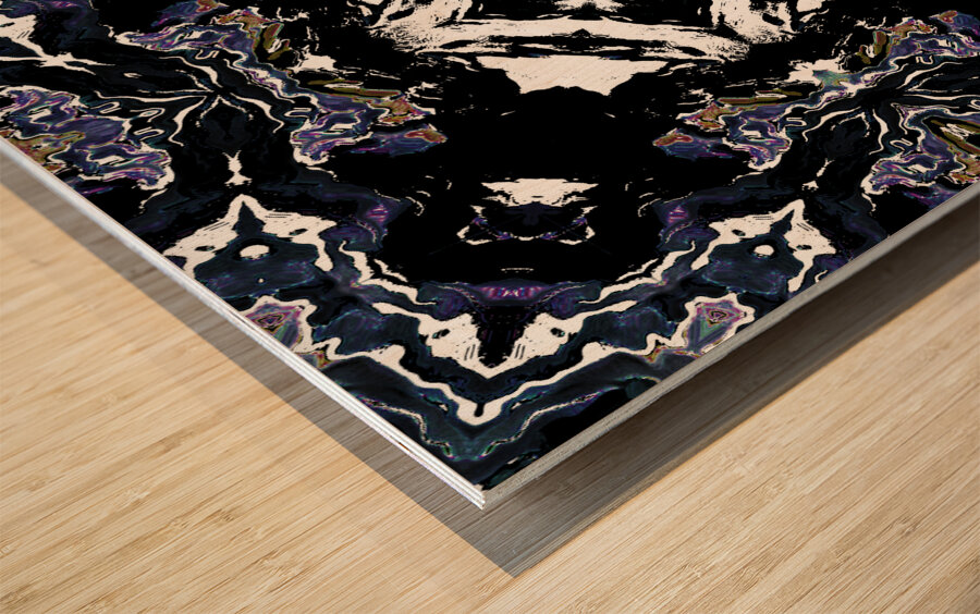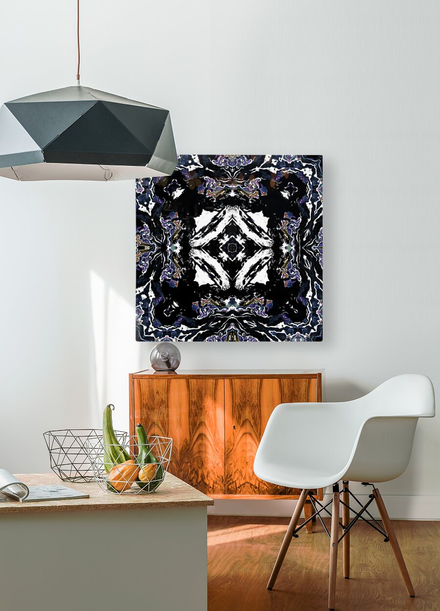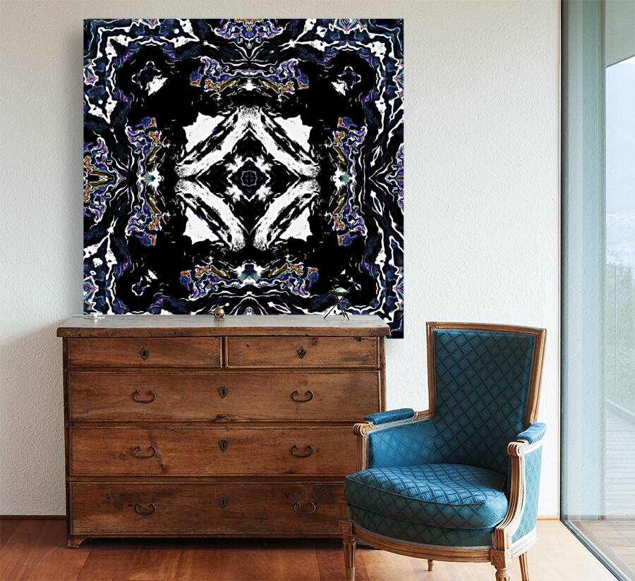 Originally a hand painted acrylic laterally digitally manipulated (using various means including repper.com) into a stunning piece of contemporary abstract art. An intricate kaleidoscopic pattern is formed by swirling lines and mirrored shapes in black, white, and hints of purple and blue. The symmetrical design creates a visually engaging and complex motif.