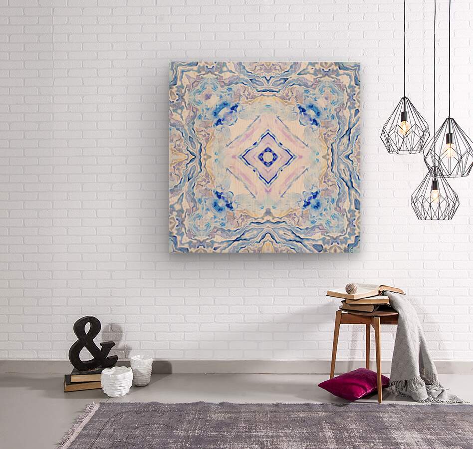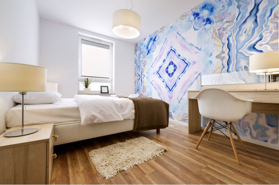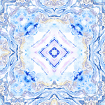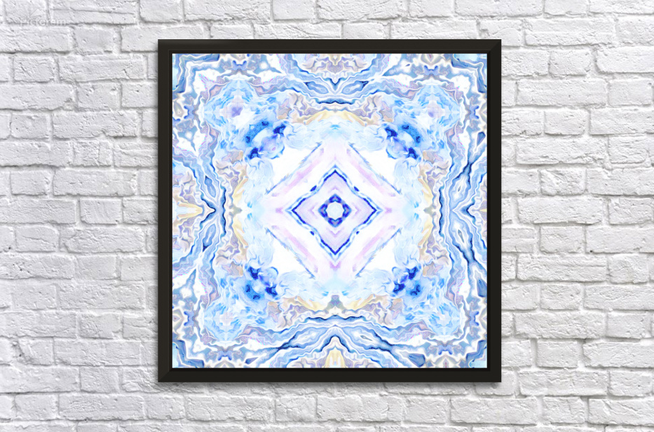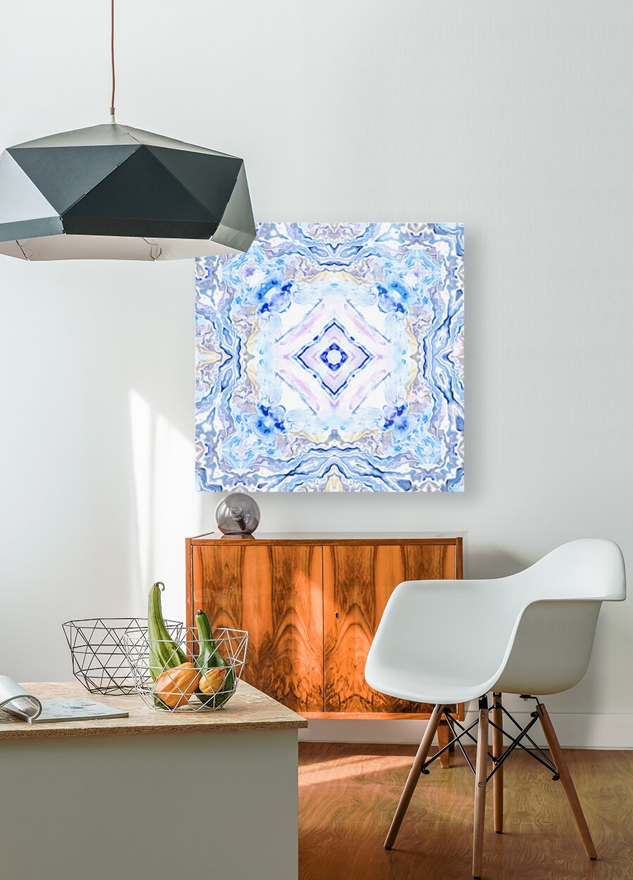 Originally a hand painted acrylic laterally digitally manipulated (using various means including repper.com) into a stunning piece of contemporary abstract art. Features a symmetrical pattern formed with soft hues of blue, lavender, and cream, creating a calming and intricate visual effect. The design is reminiscent of marbled stone or ice formations.