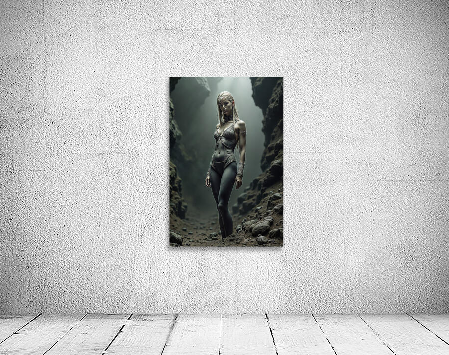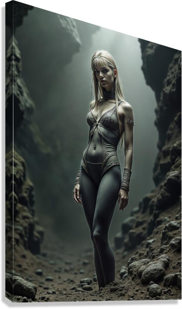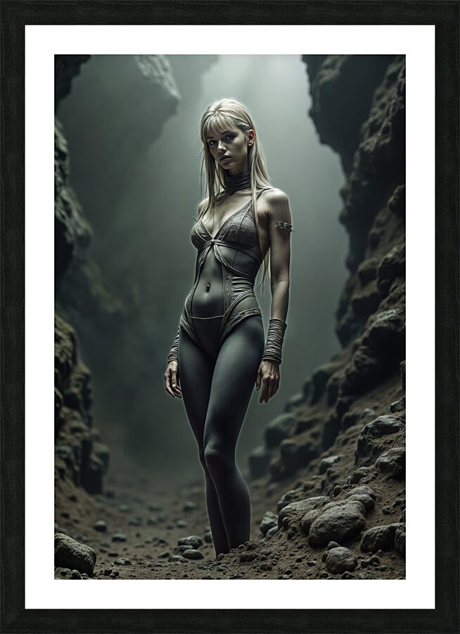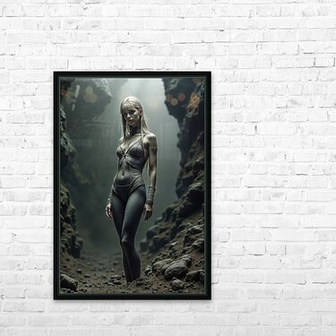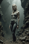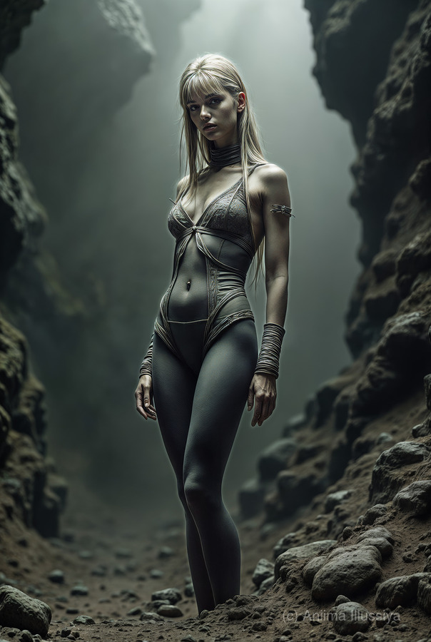 The character is a slender seemingly young woman with very pale skin and long straight light blonde hair that falls past her shoulders. Her features are delicate and somewhat androgynous. Her physique suggests a lean perhaps even somewhat frail build lacking significant muscle definition. She wears a form-fitting one-piece garment that resembles a bodysuit or leotard. The material appears to be a rough possibly earthy-toned fabric perhaps leather or a similar material giving a muted greyish or taupe color overall. The garment is simple in design with minimal adornment. It features a low neckline and appears to be molded to her body. She also wears simple thin bands or wraps around her wrists. A thin choker-like necklace is visible around her neck. The overall impression is one of minimal clothing suggesting a focus on practicality and functionality rather than ornamentation. The clothing appears to be soiled or stained possibly with dirt or ash. Her posture is straight almost rigidly so suggesting a sense of quiet alertness or even tension. She stands with her weight evenly distributed her gaze directed forward neither defiant nor submissive. Her stillness suggests a sense of patience or perhaps waiting. There is no visible action happening in the picture she seems to be posed possibly awaiting something or someone. Based solely on the image her temperament is difficult to definitively determine. However several possibilities suggest themselves. Her posture and the setting could indicate either strength and resilience in the face of hardship or perhaps a sense of vulnerability and isolation. The muted colors of her clothing and the somber background reinforce this ambiguity. She could be stoic reserved wary or even magically potent all depending on the context of the story. The overall impression is one of mystery and quiet intensity.