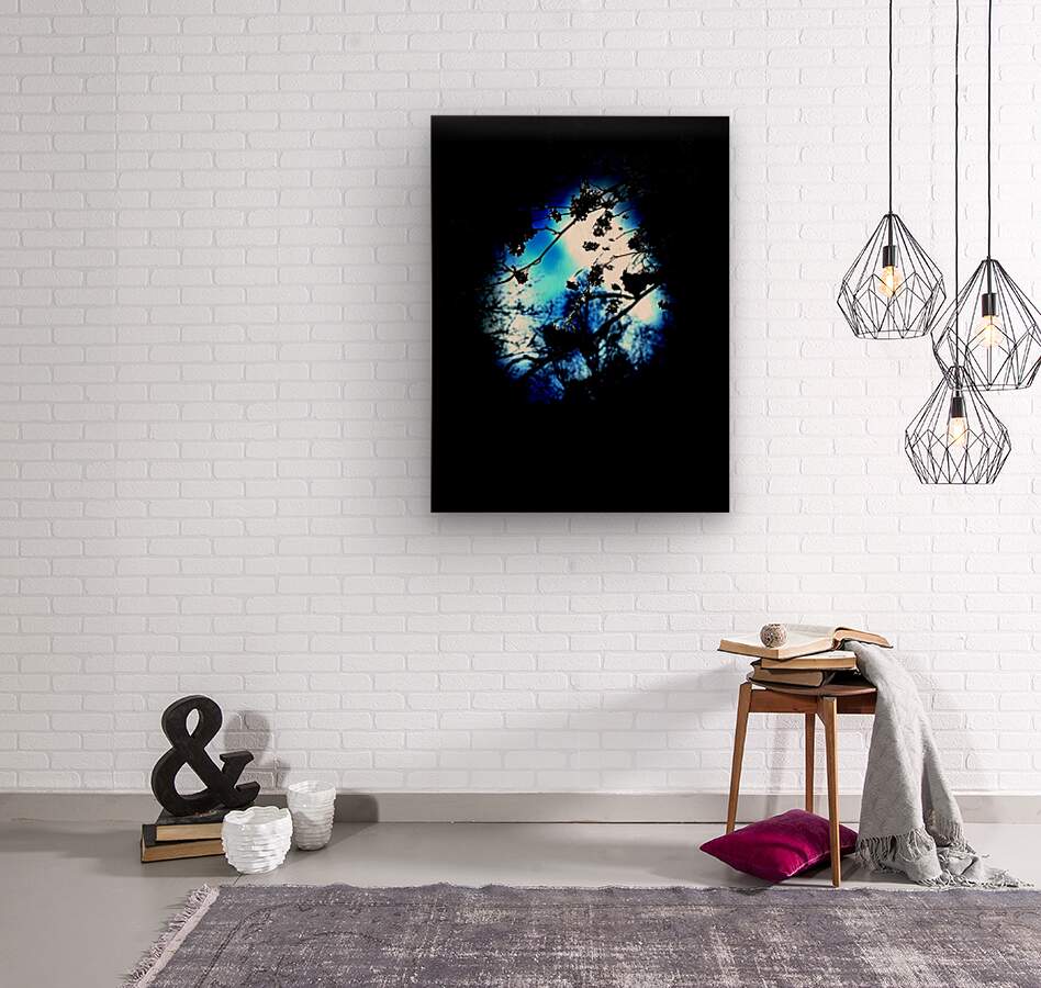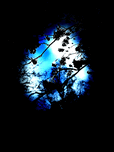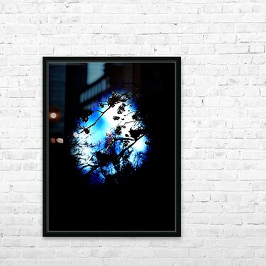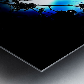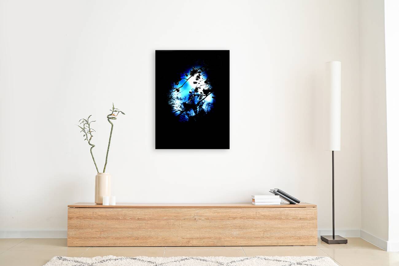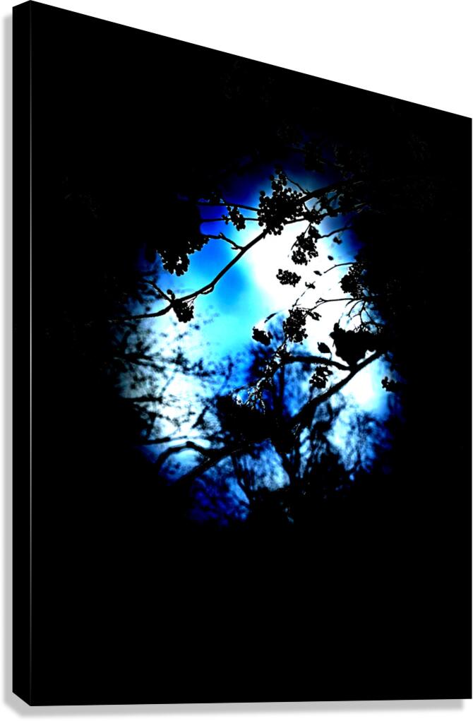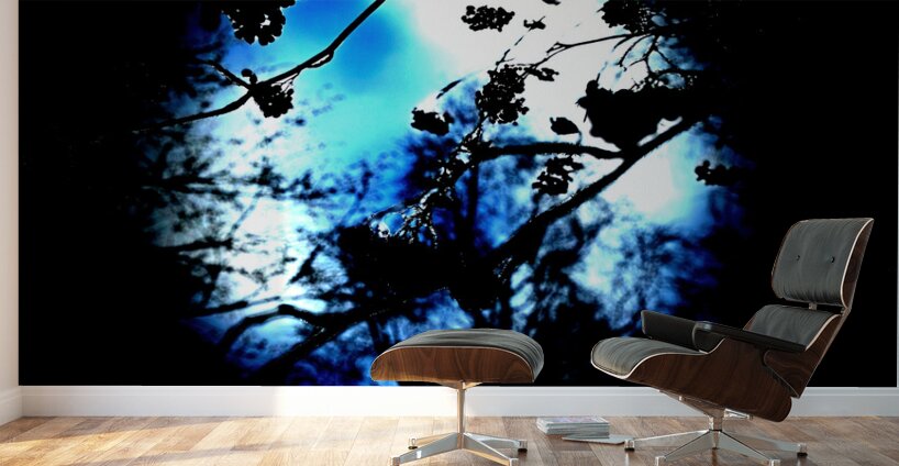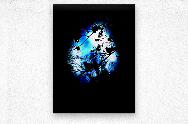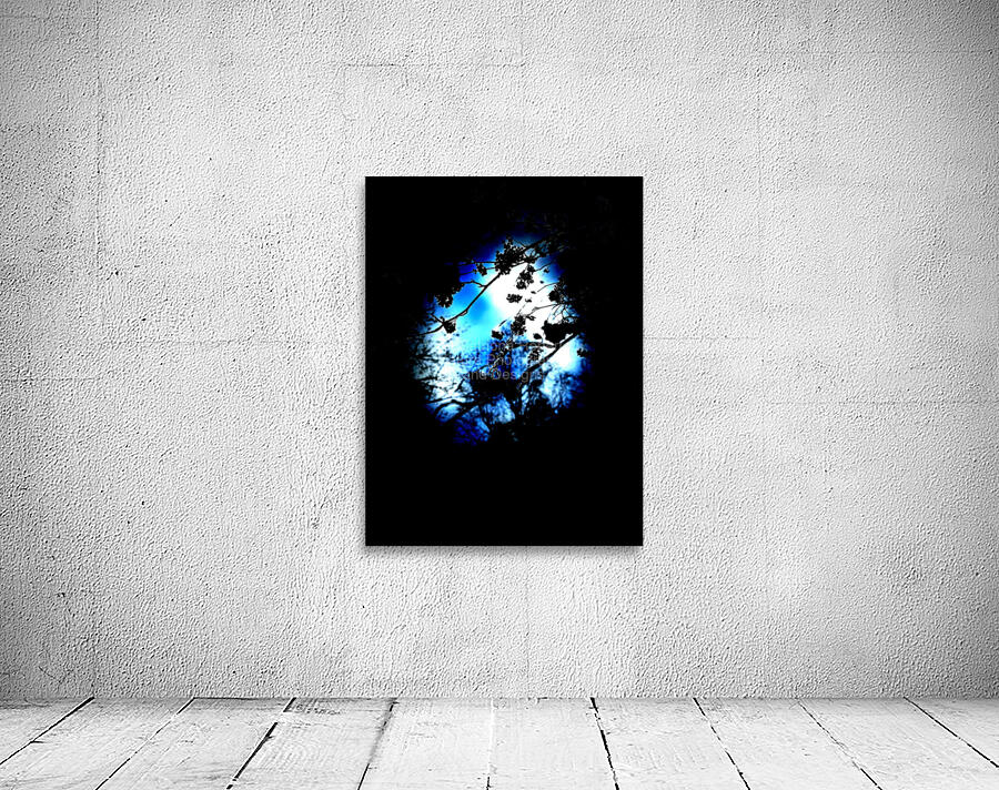 I originally took a photo of Rowan Berries and laterally digitally manipulated them into a stunning piece of abstract art. Features silhouetted branches with clusters of leaves appearing to be dramatically lit against a bright blue and white sky. The scene creates a striking contrast between the dark foreground and the illuminating sky.