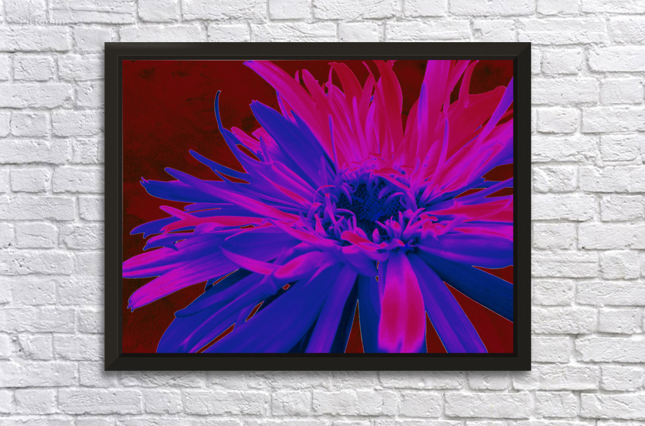 Originally a hand painted acrylic and a close up photo of a Daisy Flower laterally digitally combined and further manipulated to create this stunning piece of contemporary floral art. Features a vibrant Daisy displaying striking purple and pink petals against a deep red abstract background, creating a vivid contrast. The petals radiate outward, showcasing intricate details and bold color tones.