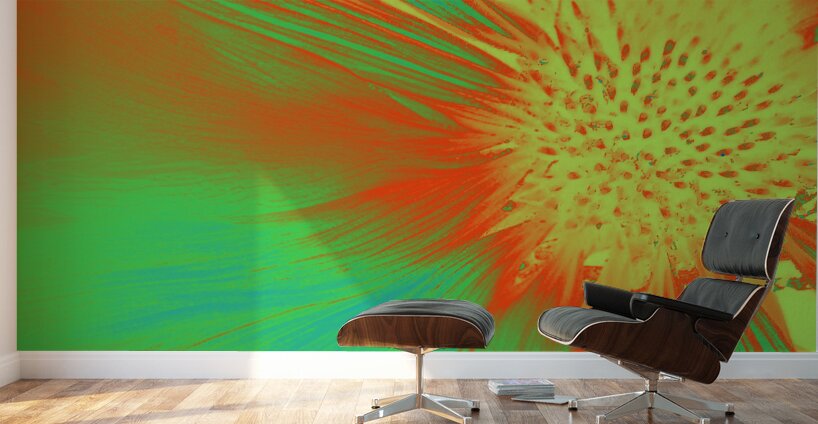 Originally a close up photo of a Cone flower laterally digitally manipulated using various means including the Magic AI Grab, layering and colour filters in canva.com) enabled this stunning piece of contemporary floral art to emerge. Features vibrant hues of green and red sweep across the floral composition, with delicate lines extending outward from a bright, textured center. The arrangement emphasizes both the intricate details and bold use of contrasting colors.