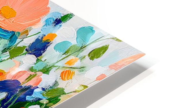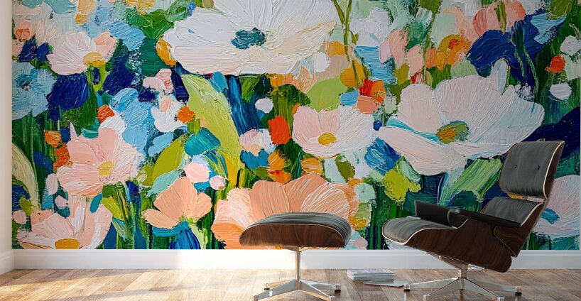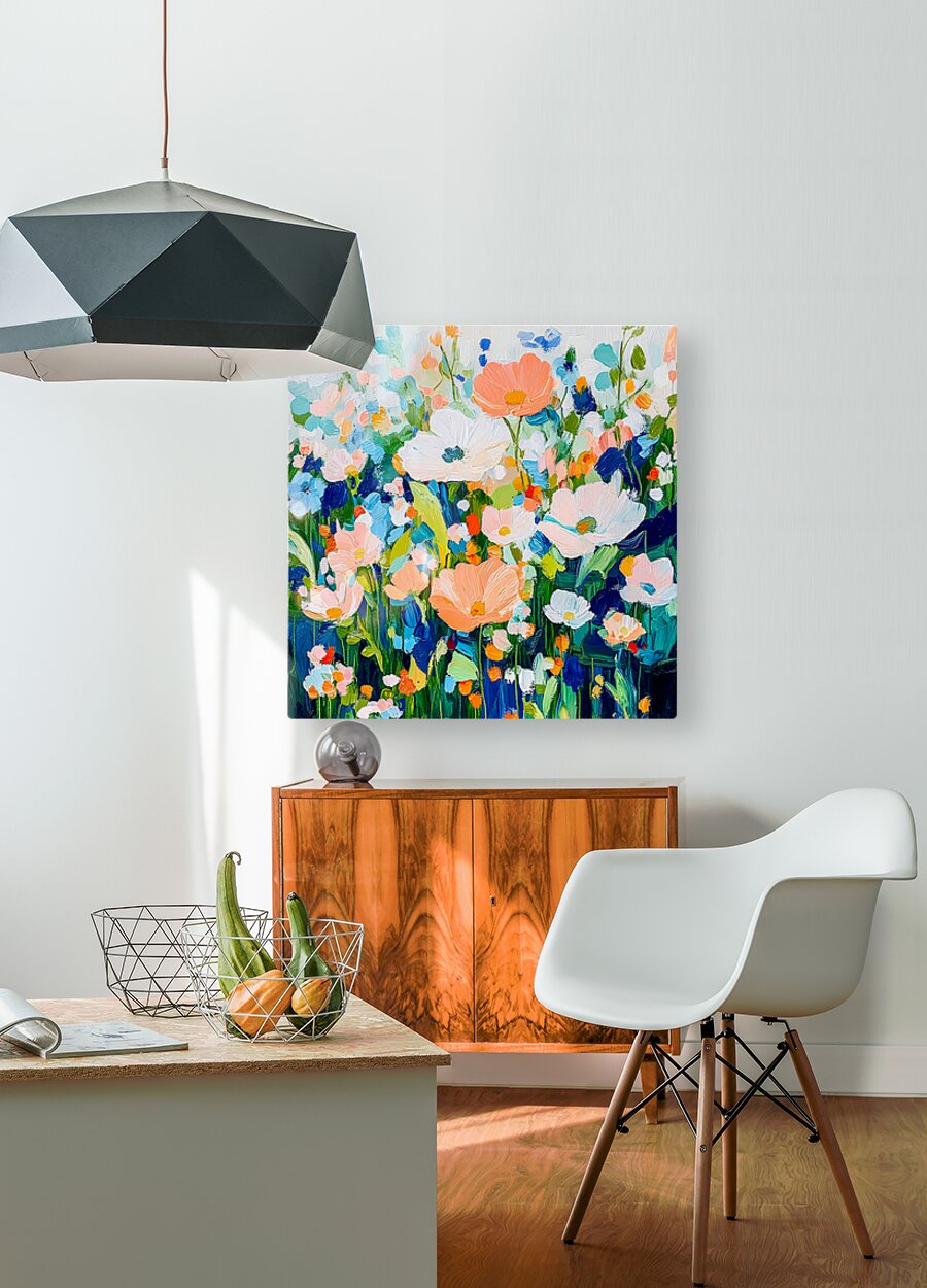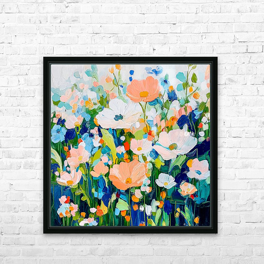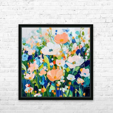 A vibrant array of flowers in various shades of pink orange and blue creates a lively and colorful scene. The brushstrokes are bold and expressive giv...[+]