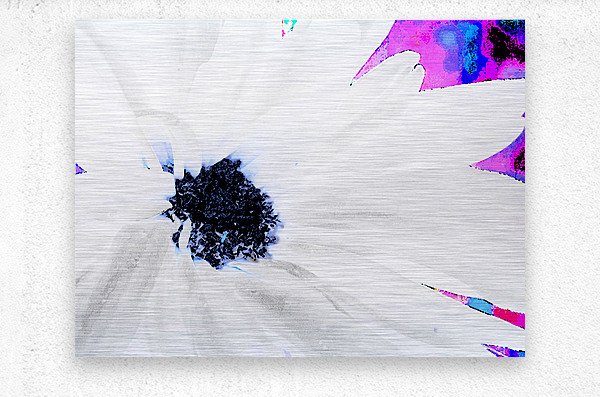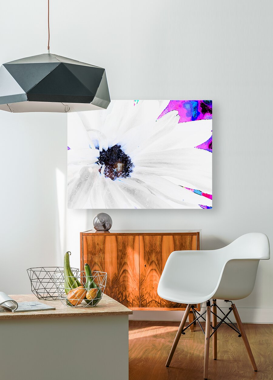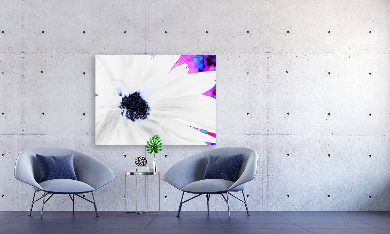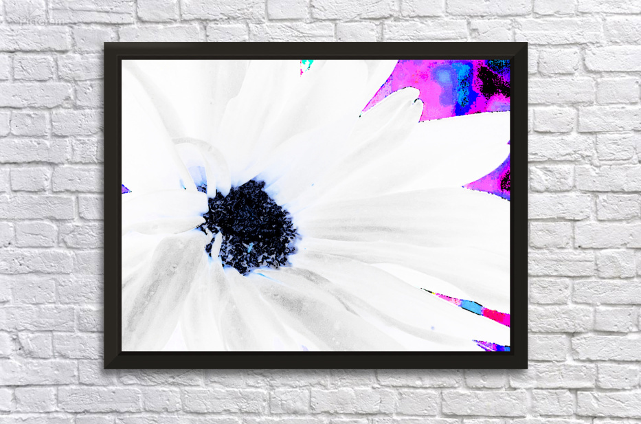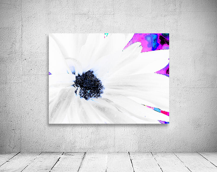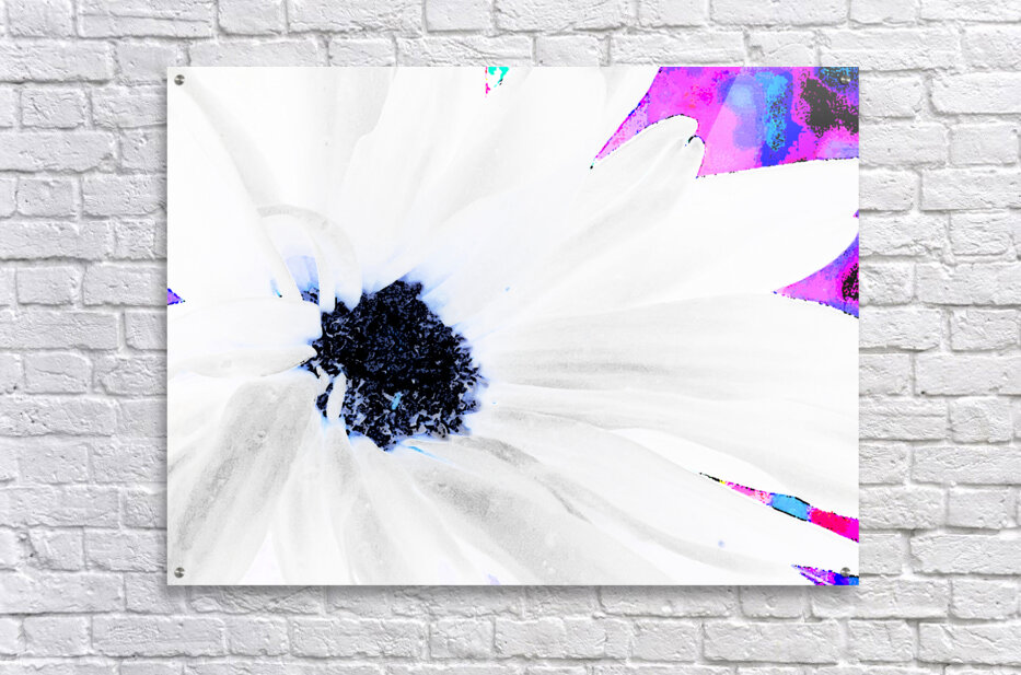 Originally a close up photo of a Daisy flower laterally digitally manipulated to create a stunning piece of contemporary floral art. Feature a Daisy with delicate white petals and a dark center standing out against a vibrant, multicolored background. The bright pink and blue hues create a striking contrast with the flower's pale tones.