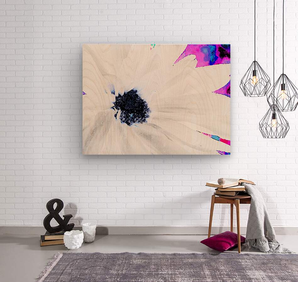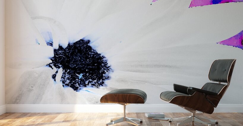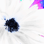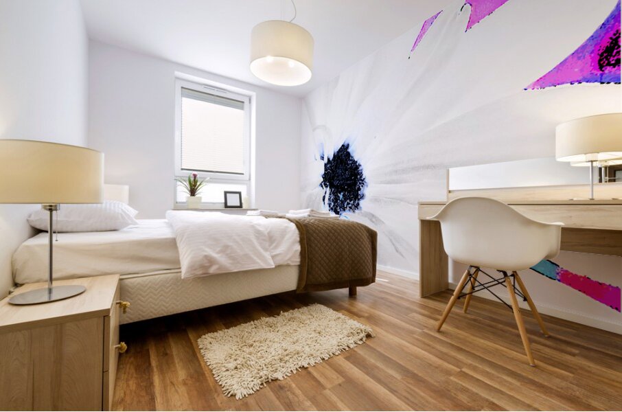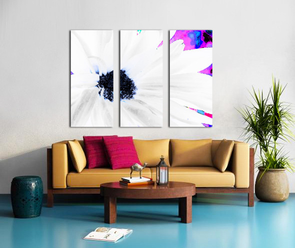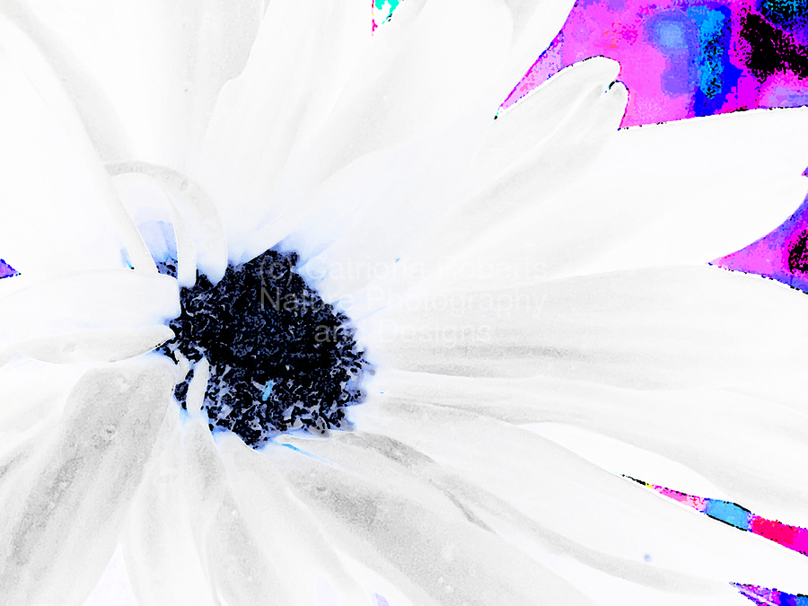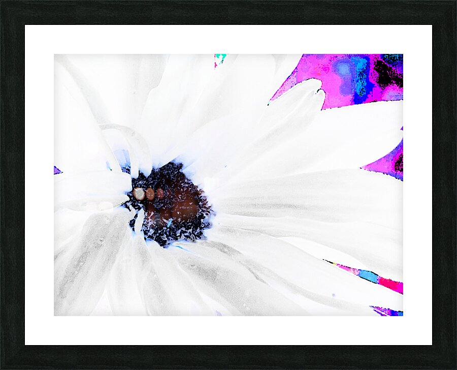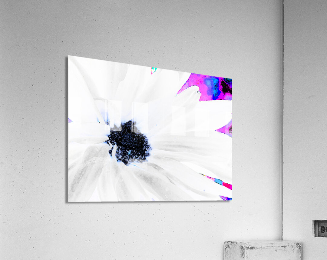 Originally a close up photo of a Daisy flower laterally digitally manipulated to create a stunning piece of contemporary floral art. Feature a Daisy with delicate white petals and a dark center standing out against a vibrant, multicolored background. The bright pink and blue hues create a striking contrast with the flower's pale tones.