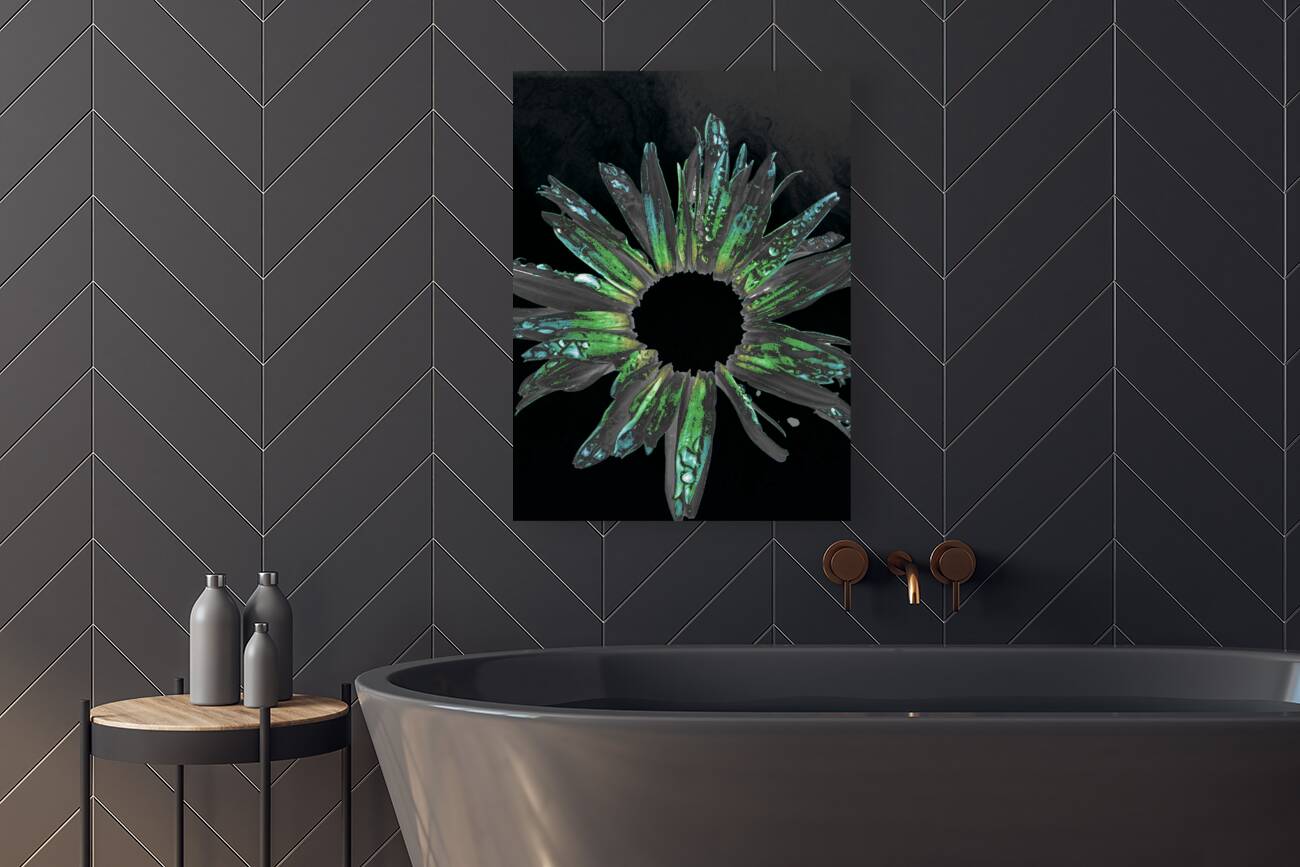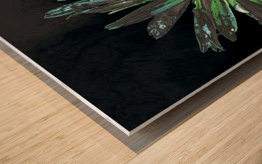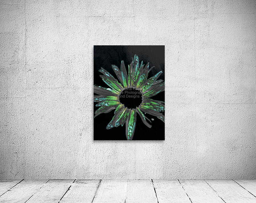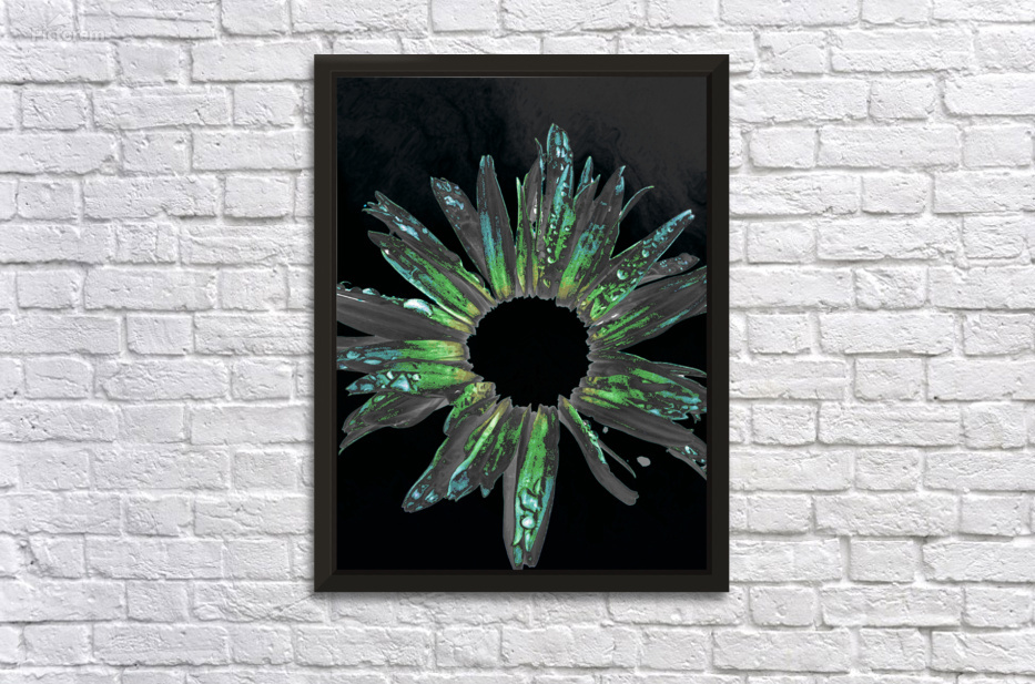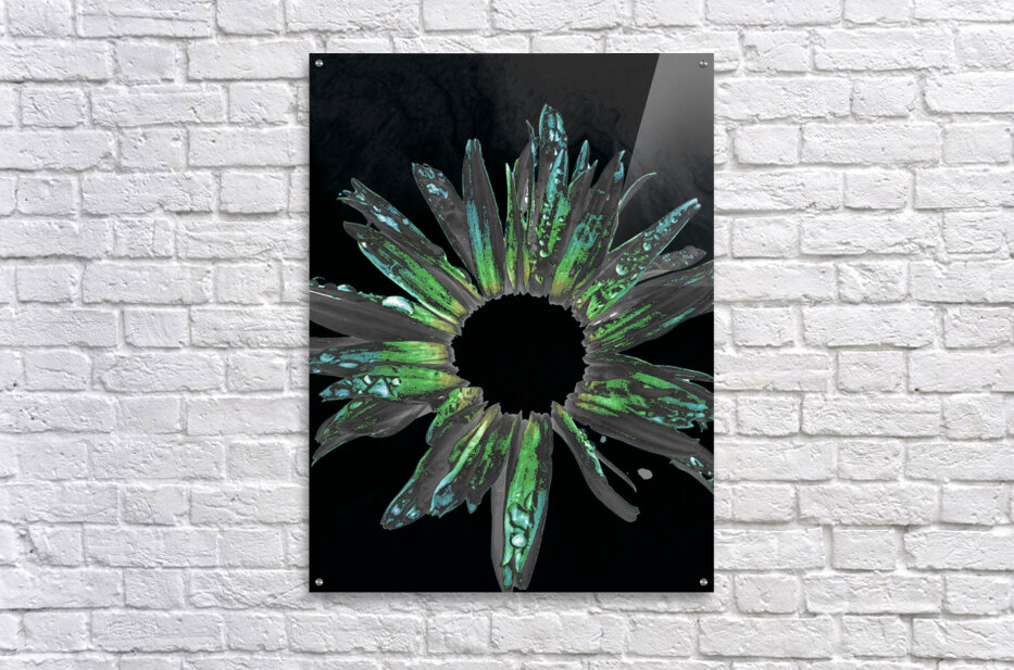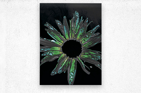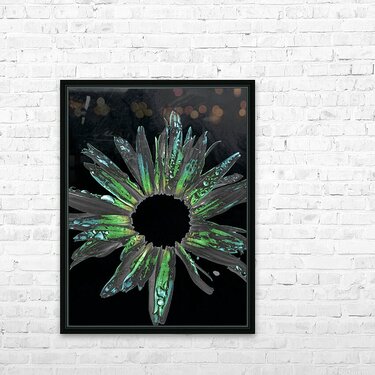 Originally a close up photo of a Daisy flower and a hand painted acrylic, laterally digitally combined and manipulated to create a stunning piece of contemporary floral art. Features a striking Daisy with petals in vibrant shades of green and black set against a deep, dark background. The contrast highlights intricate patterns and textures on each petal, creating a captivating visual effect. Traces of water droplets can also be seen on the petals.