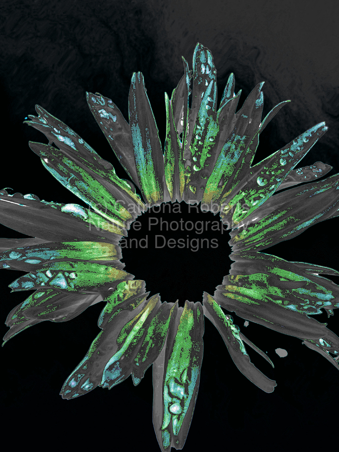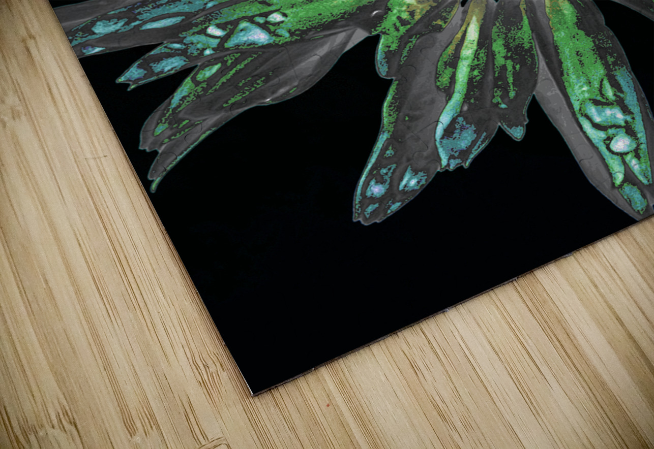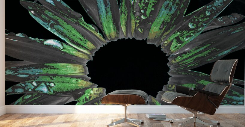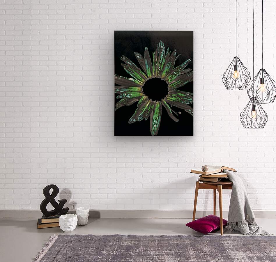 Originally a close up photo of a Daisy flower and a hand painted acrylic, laterally digitally combined and manipulated to create a stunning piece of contemporary floral art. Features a striking Daisy with petals in vibrant shades of green and black set against a deep, dark background. The contrast highlights intricate patterns and textures on each petal, creating a captivating visual effect. Traces of water droplets can also be seen on the petals.