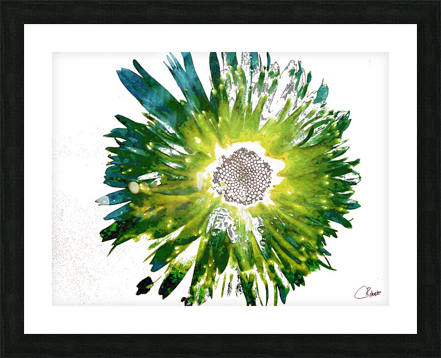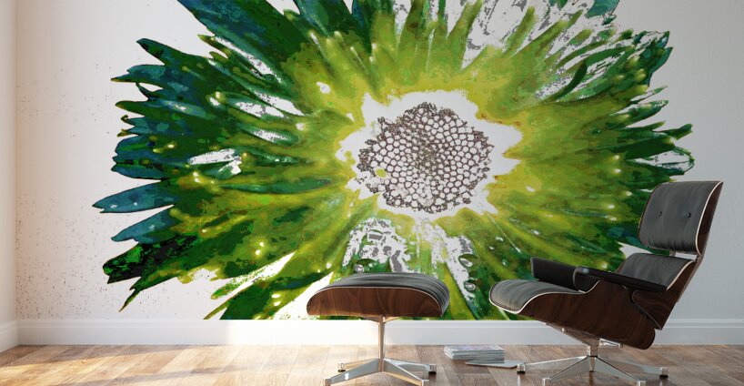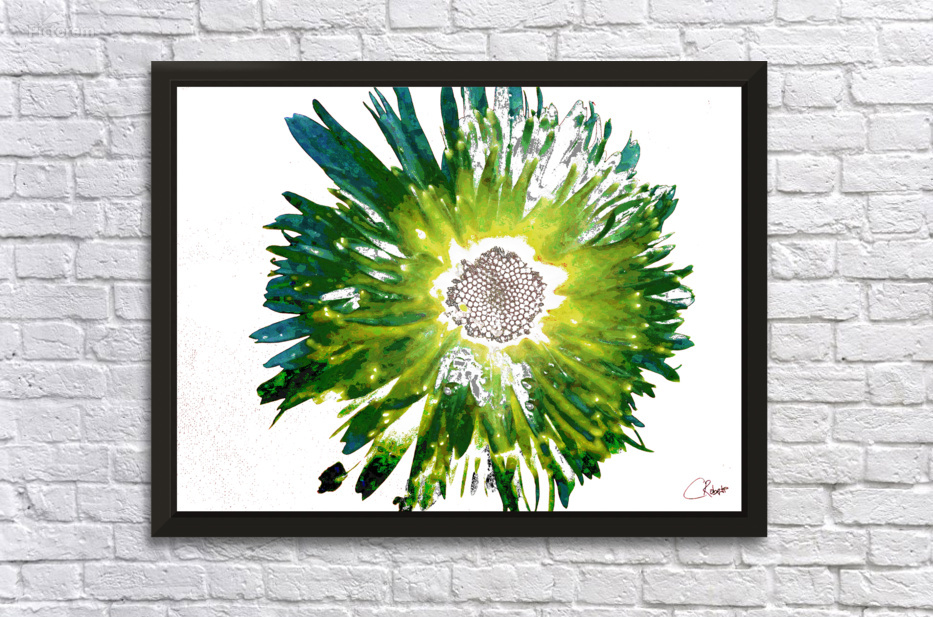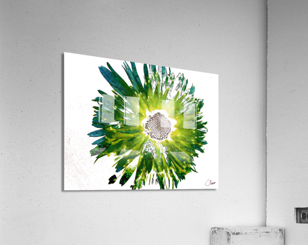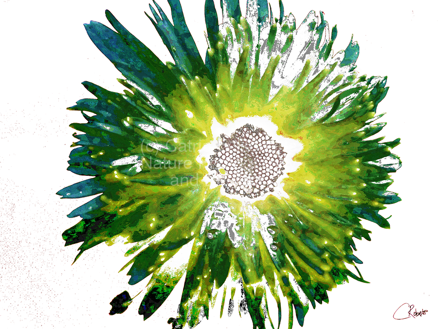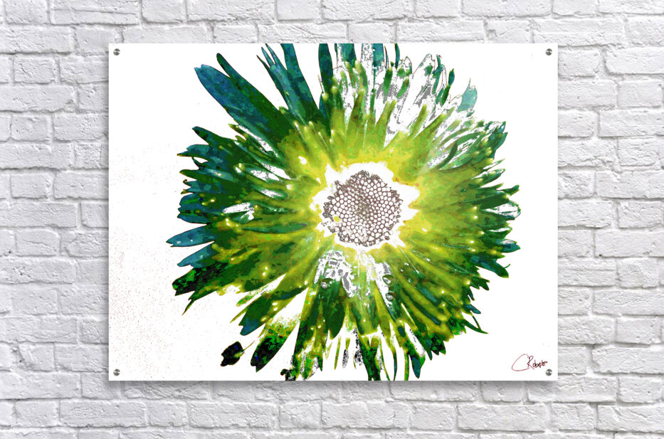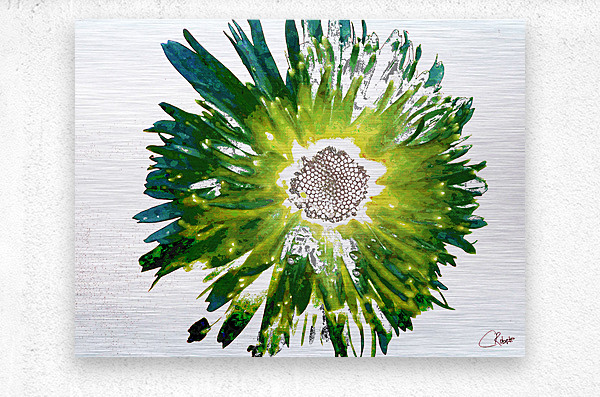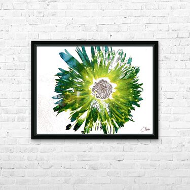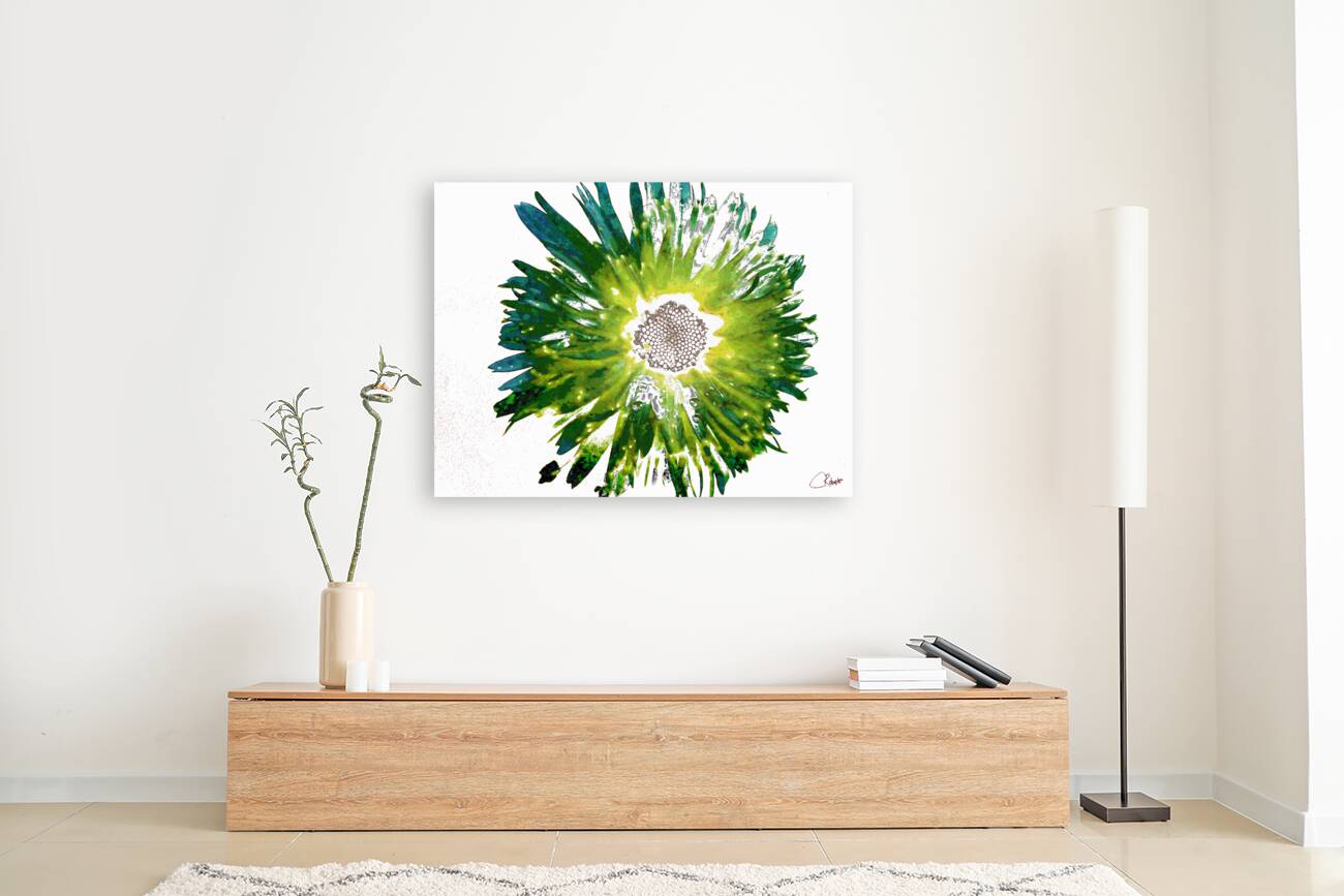 Originally a hand painted acrylic and a close up photo of a Daisy flower laterally digitally manipulated to create a stunning piece of floral contemporary art. Features a vibrant green and blue Daisy with a detailed central pattern appearing to burst with energy against a white background. The petals have a dynamic, sweeping motion that adds a sense of movement and life.