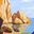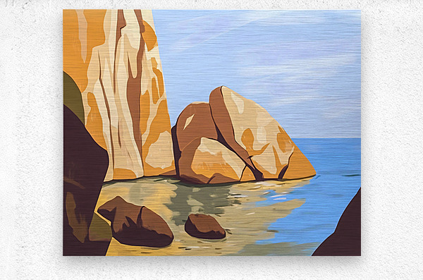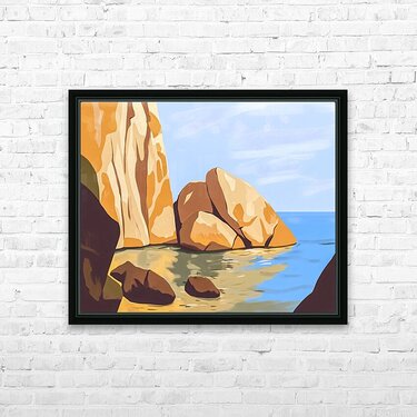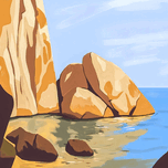 Sunlit rocky cliffs rise beside a calm blue sea with reflections shimmering on the waters surface. Large boulders in varying shades of brown and tan c...[+]