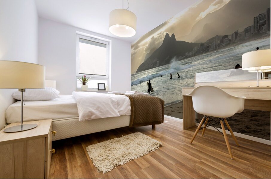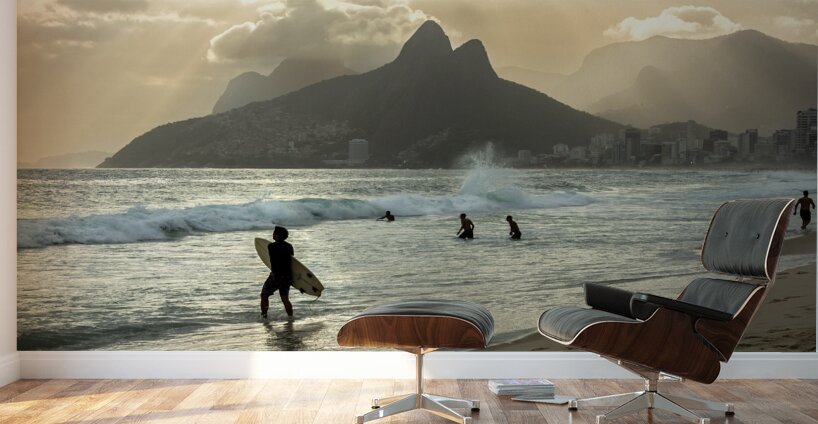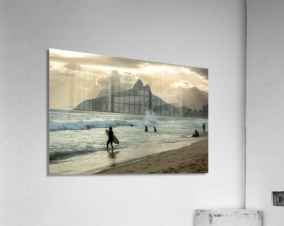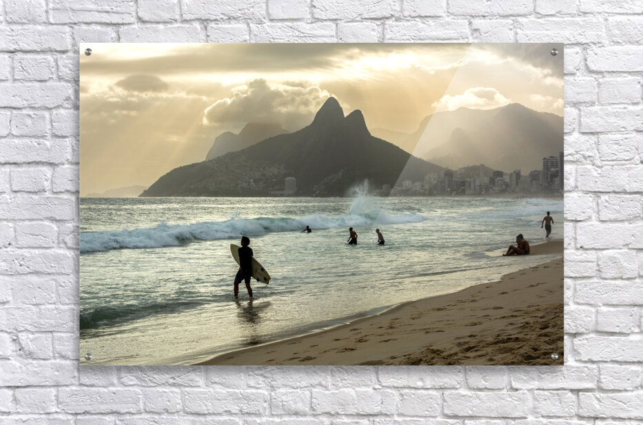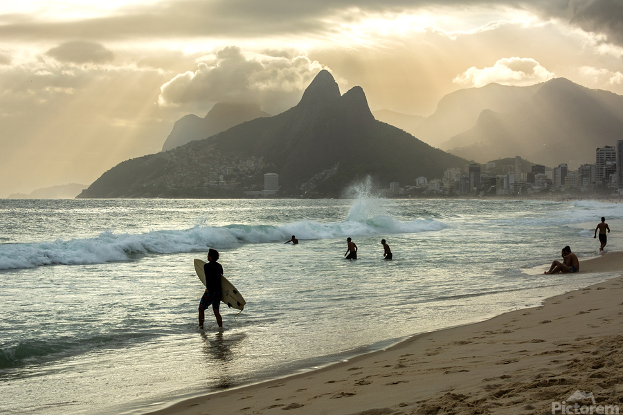 ABOUT THIS ARTWORK: SURFER WALKING INTO THE OCEAN AT IPANEMA BEACH IN RIO DE JANEIRO IN BRAZIL AT SUNSET