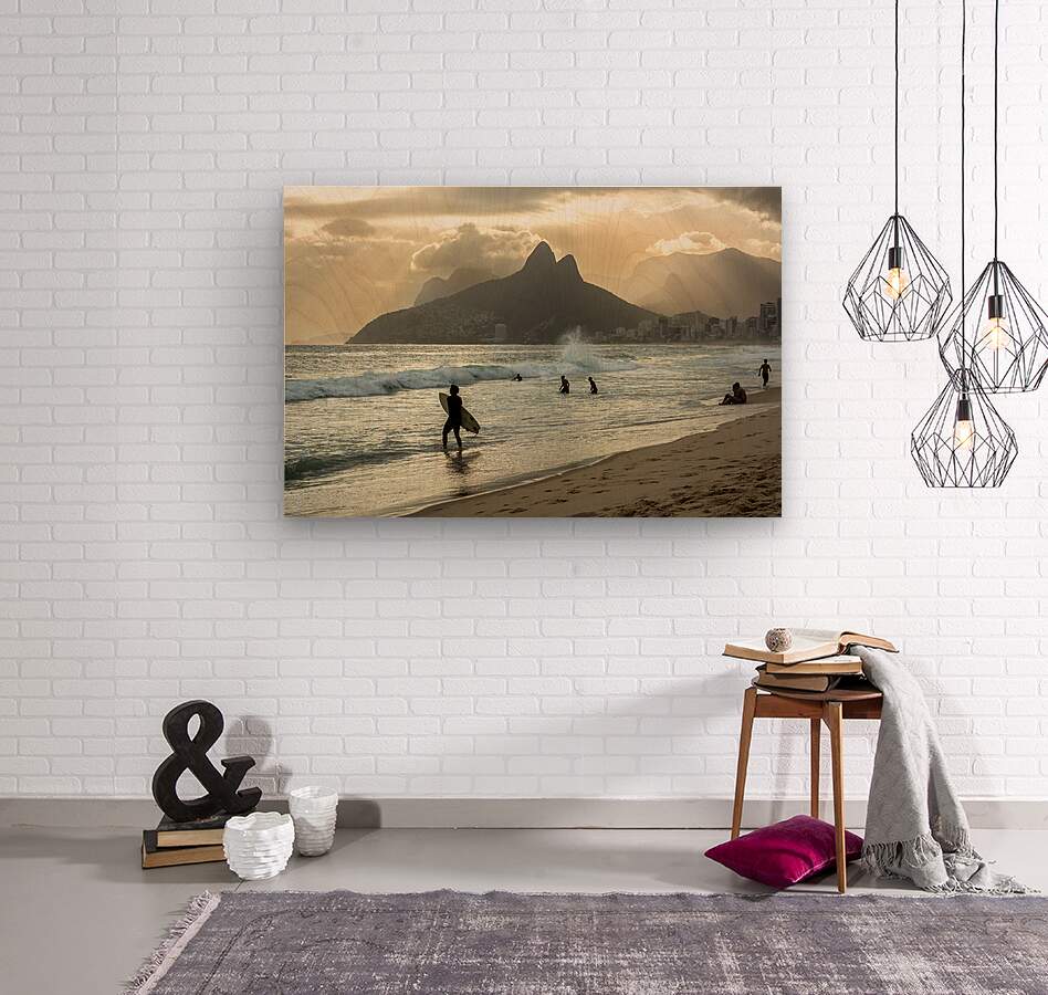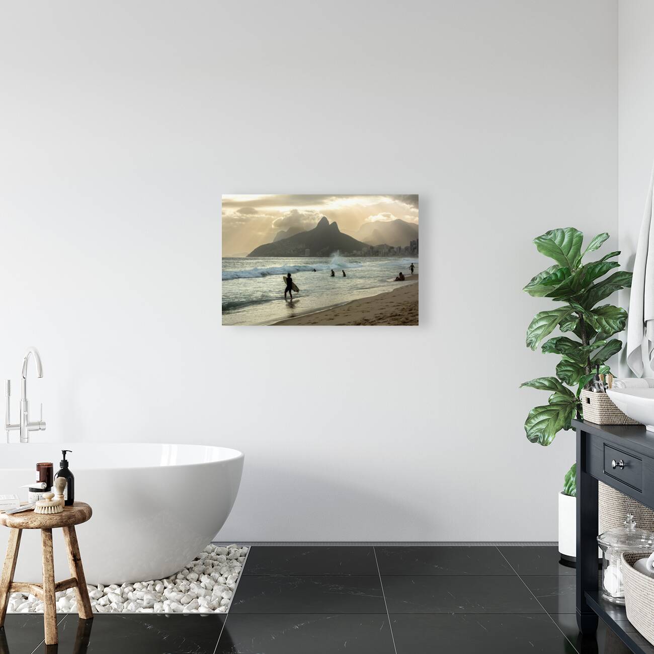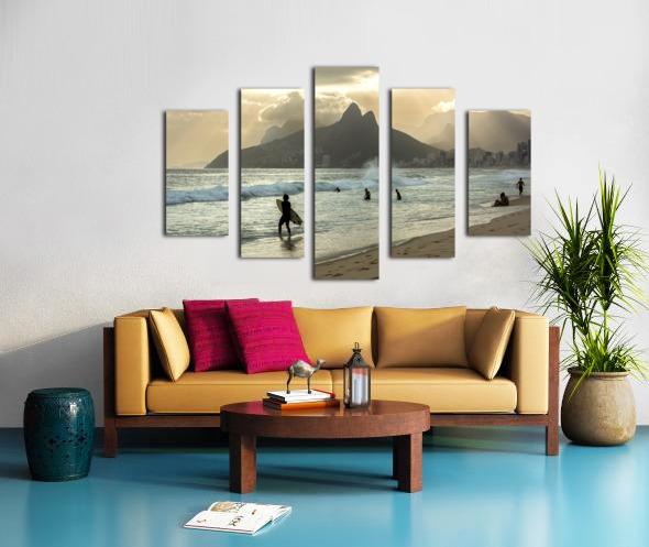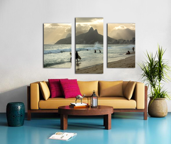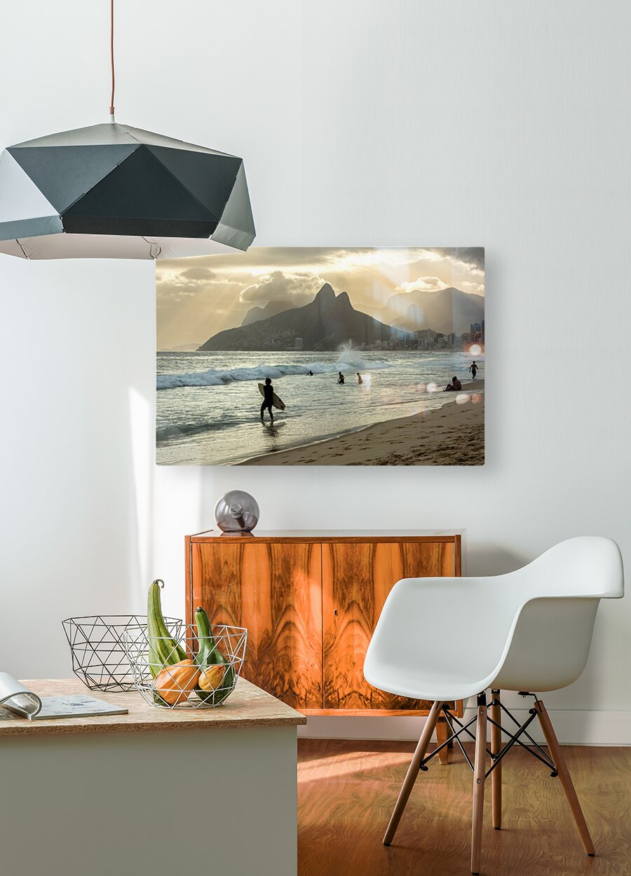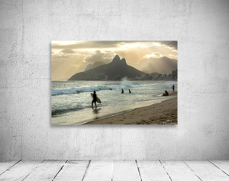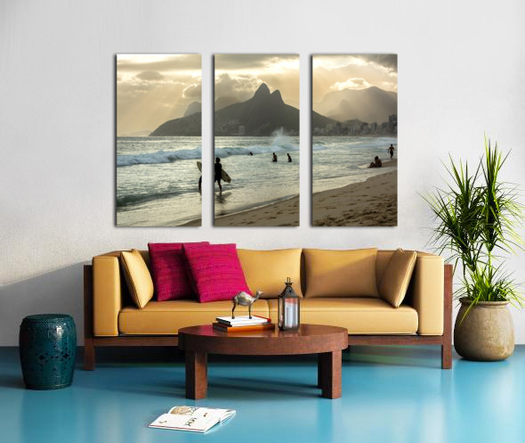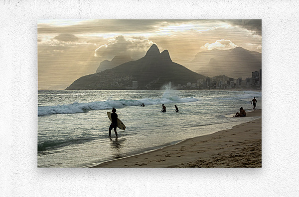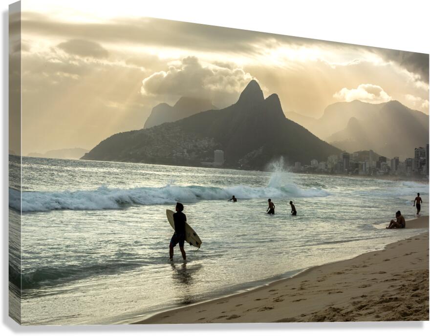 SURFER WALKING INTO THE OCEAN AT IPANEMA BEACH IN RIO DE JANEIRO IN BRAZIL AT SUNSET CALADOART  Canvas Print