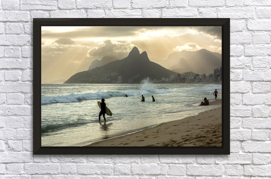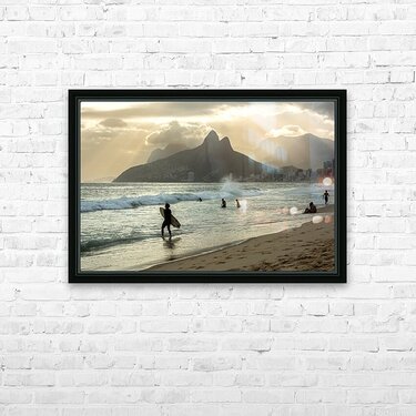 Surfer walking into the ocean at Ipanema Beach in Rio de Janeiro in Brazil at sunset Frame print