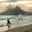 SURFER WALKING INTO THE OCEAN AT IPANEMA BEACH IN RIO DE JANEIRO IN BRAZIL AT SUNSET