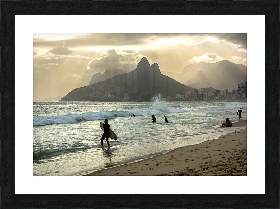 Surfer walking into the ocean at Ipanema Beach in Rio de Janeiro in Brazil at sunset Picture Frame Printing