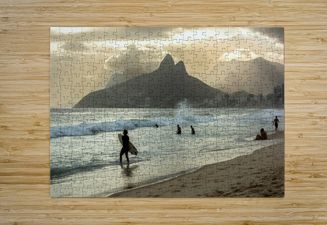 Surfer walking into the ocean at Ipanema Beach in Rio de Janeiro in Brazil at sunset caladoart Puzzle printing