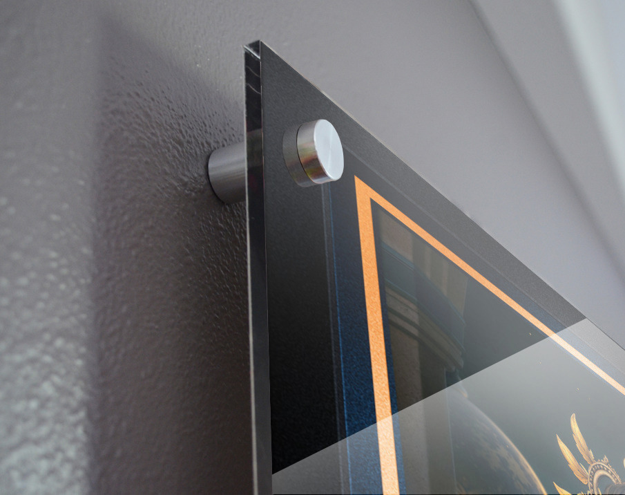 Printed to the edge - Ready to hang - provided with 4 premium polished aluminum stand off ( wall screws and mounting hardware provided )