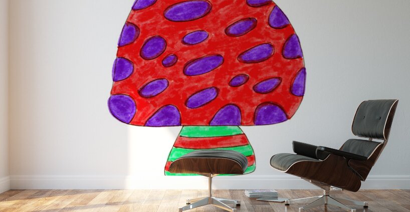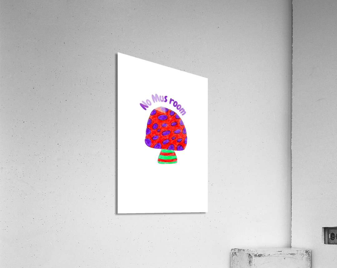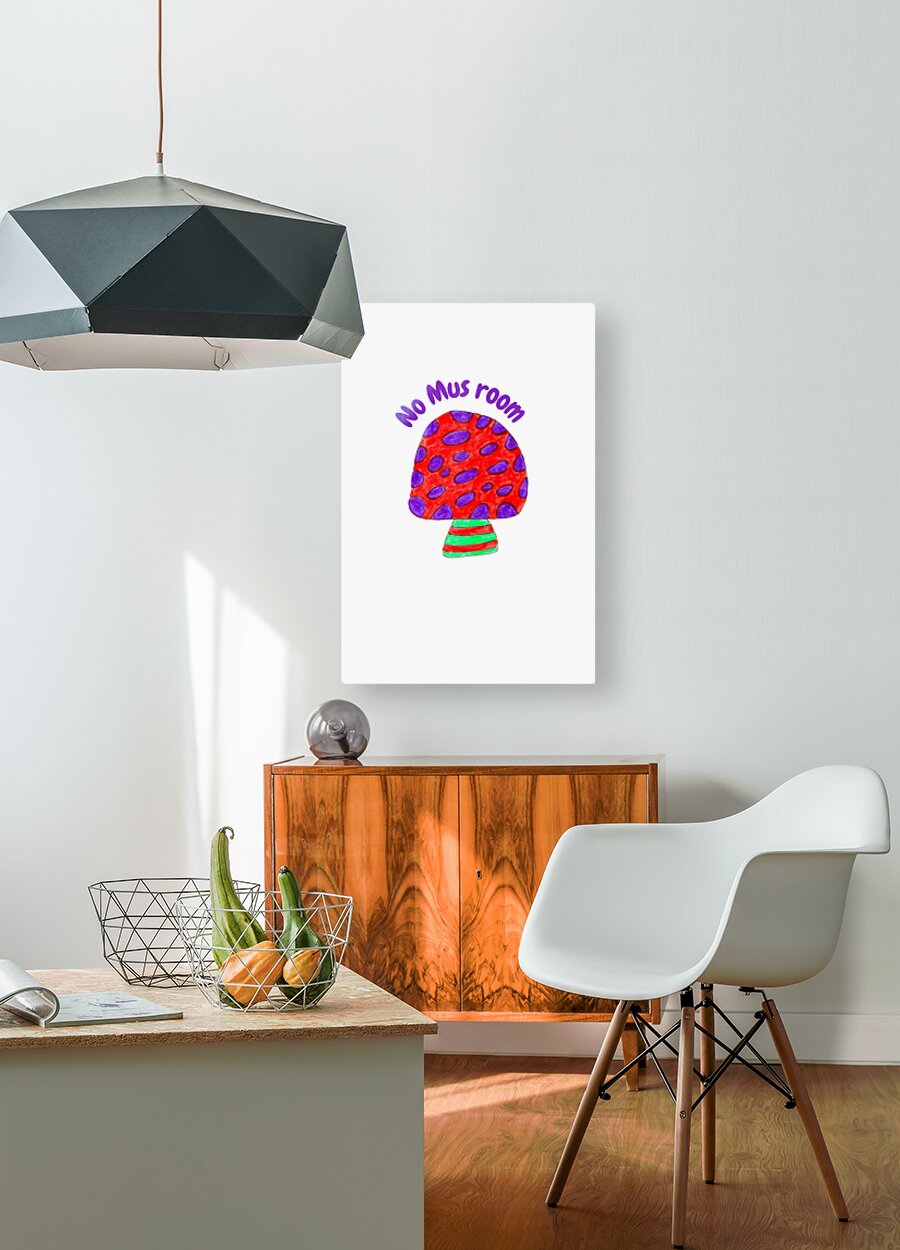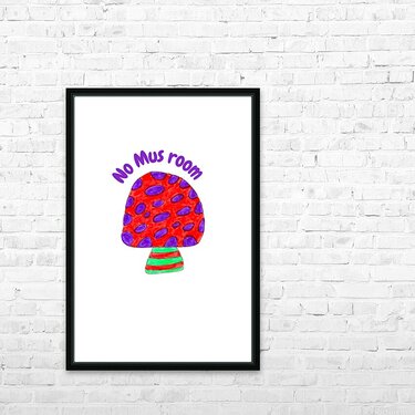 Originally a hand drawn doodle inspired design, created using coloured ink pens and paper. Laterally digitally manipulated using various means ( including the use of the AI Magic Background Remover and Curved Text in canva.com) enabled this cute art work to emerge. Features a colorful mushroom with a red cap, purple spots, and a striped stem is centered on a pale background. The phrase "No Mus room" is written playfully above the mushroom in purple letters.