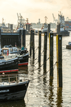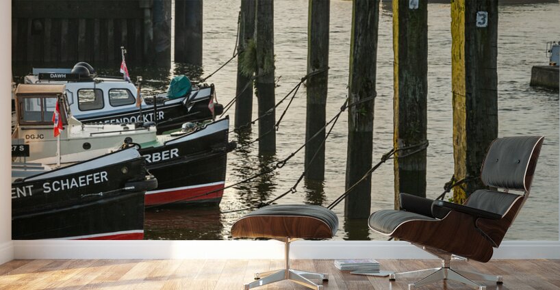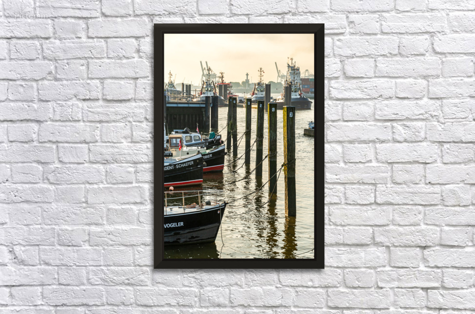 Get this artwork "Boats in the historic museum harbor in Hamburg Övelgönne at the Elbe River at sunrise " in a framed print.