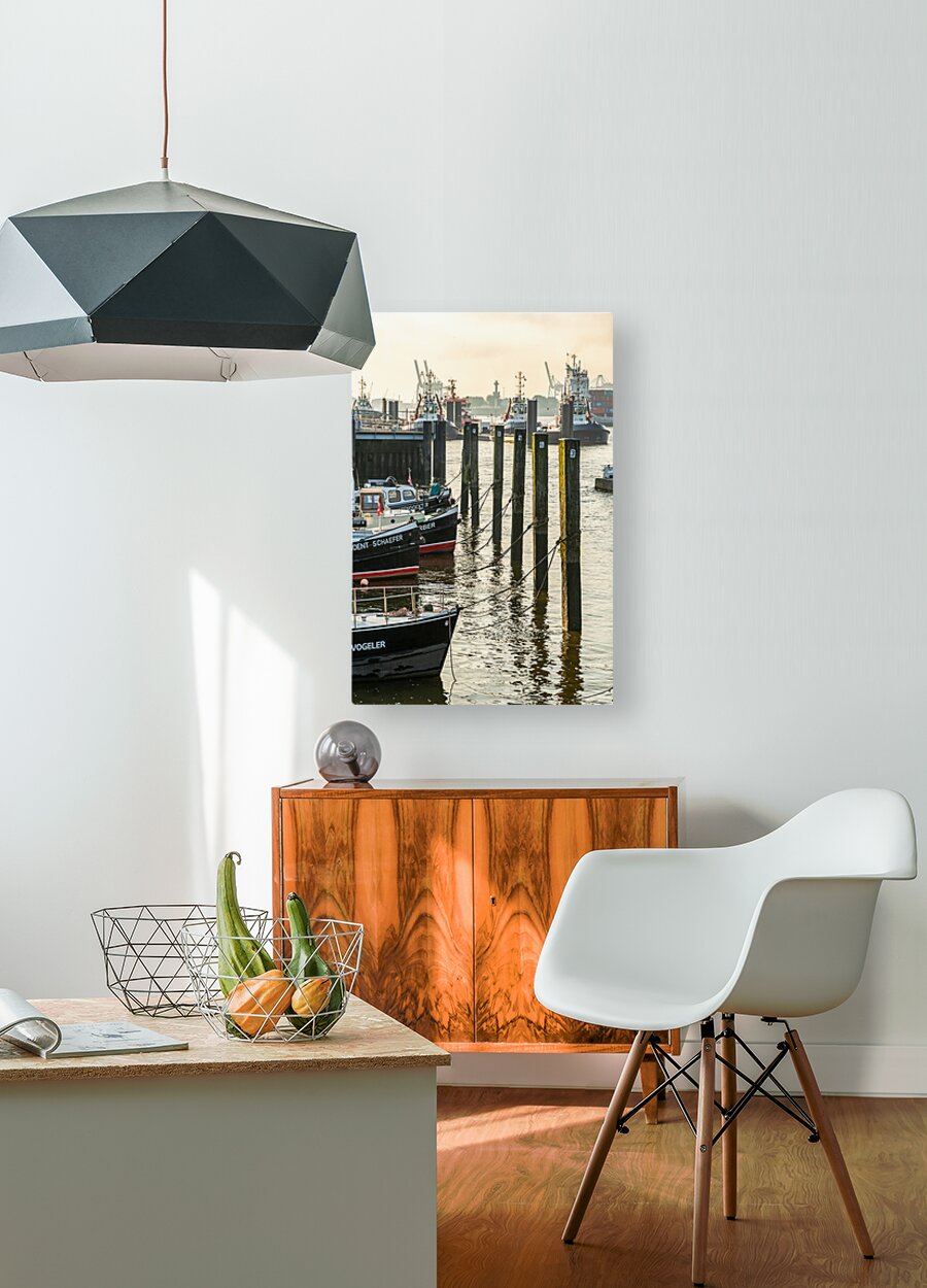 ABOUT THIS ARTWORK: BOATS IN THE HISTORIC MUSEUM HARBOR IN HAMBURG ÖVELGöNNE AT THE ELBE RIVER AT SUNRISE