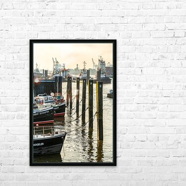 Boats in the historic museum harbor in Hamburg Övelgönne at the Elbe River at sunrise  Wall Decor Frame
