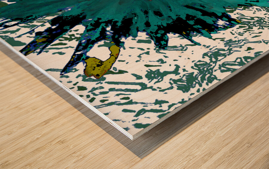 Originally a close up photo of a Daisy flower and a hand painted acrylic, laterally digitally manipulated to create a stunning piece of contemporary floral art. Features a vibrant and abstract Daisy which radiates with shades of green and teal, surrounded by dynamic splashes and swirling patterns. The central structure resembles a honeycomb, adding an intriguing texture to the overall composition.