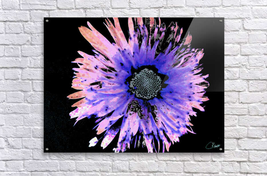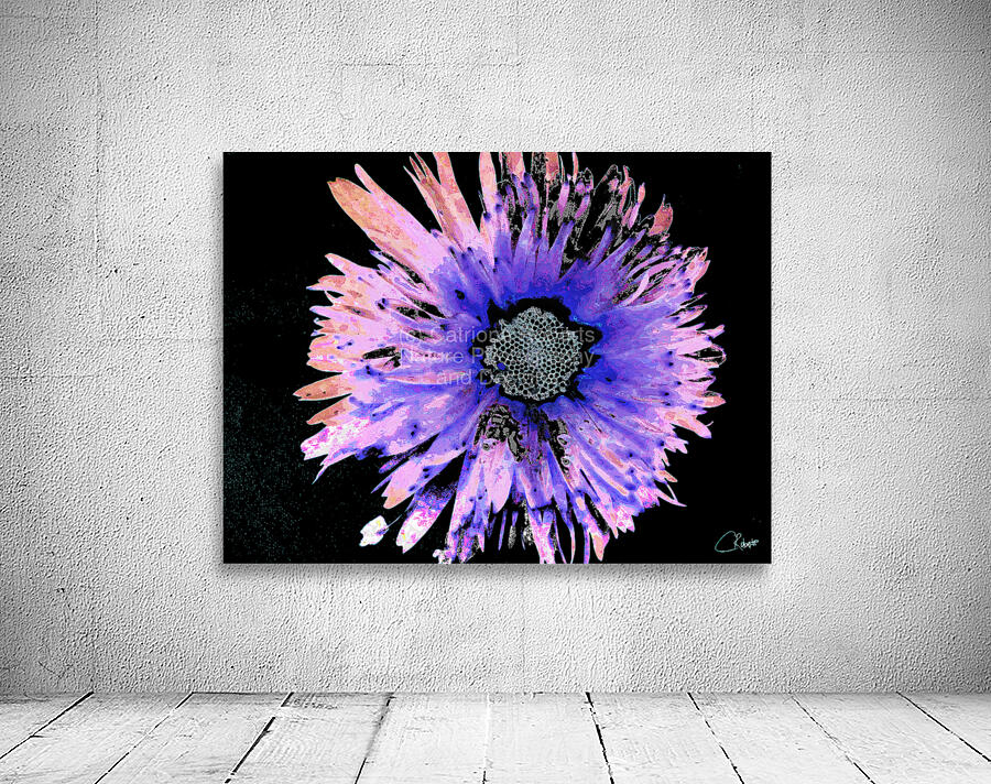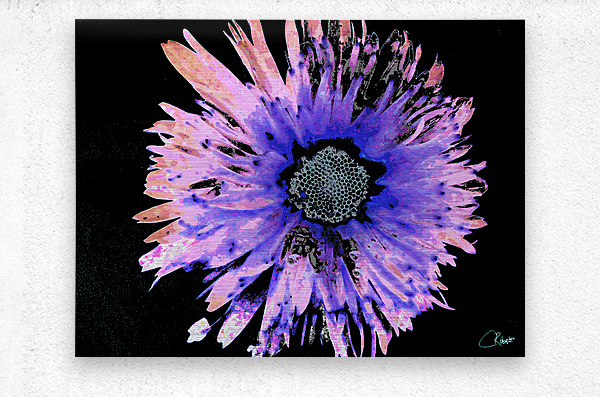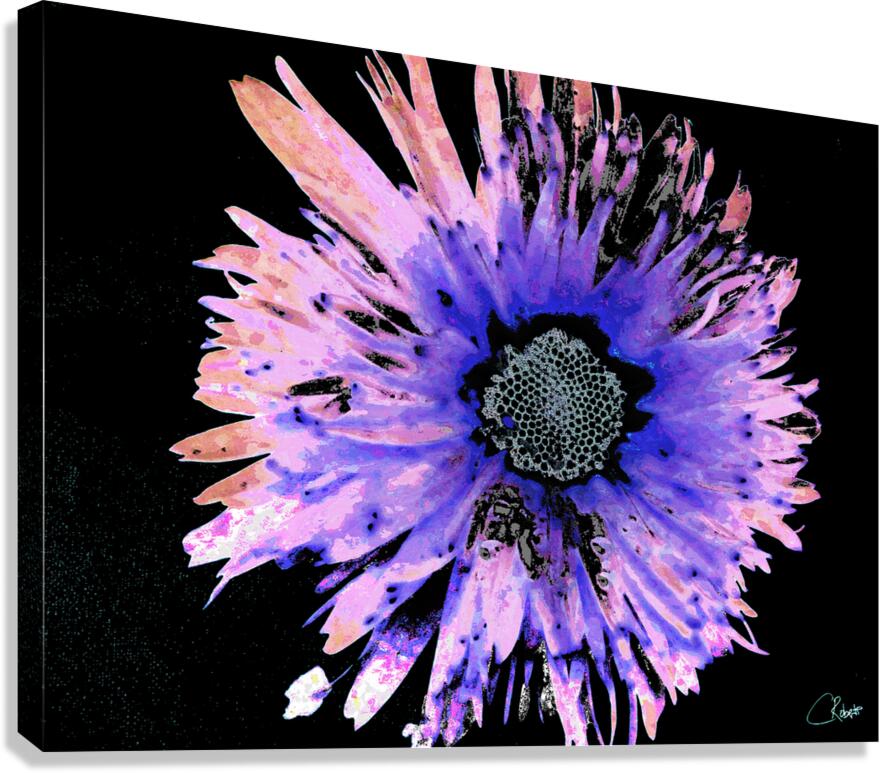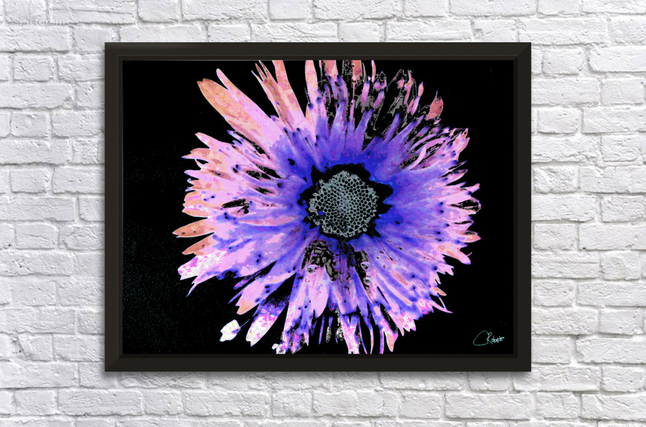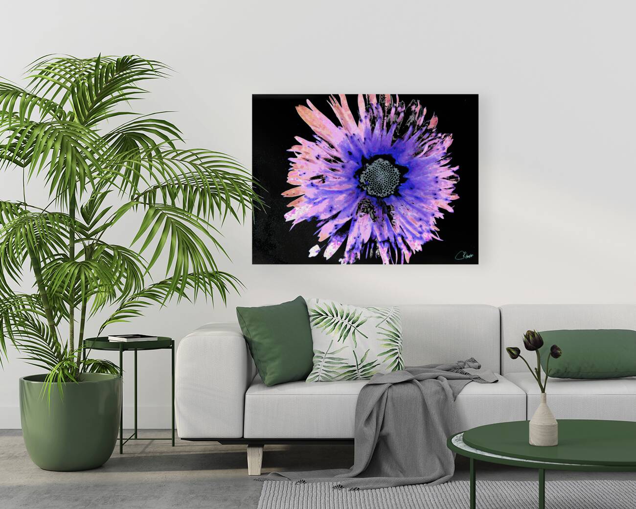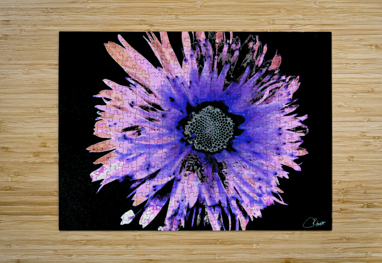 Originally a close up photo of a Daisy flower and a hand painted acrylic, laterally digitally manipulated and combined to create a stunning piece of contemporary floral art. Features a vibrant Daisy with dynamic, jagged petals spread across the canvas, varying in shades of purple and pink. The dark background enhances the striking contrasts and colors, drawing attention to the intricate details of the flower's center.