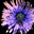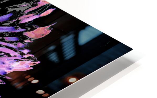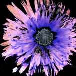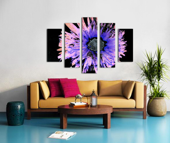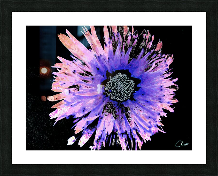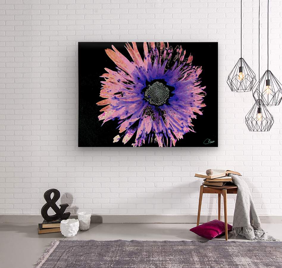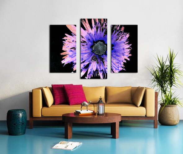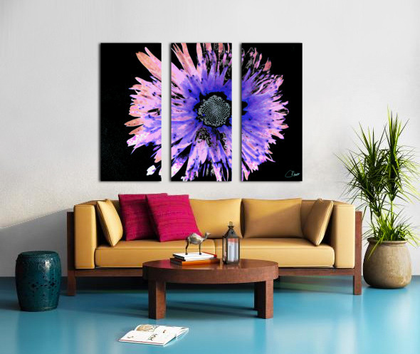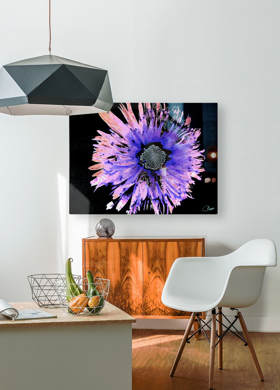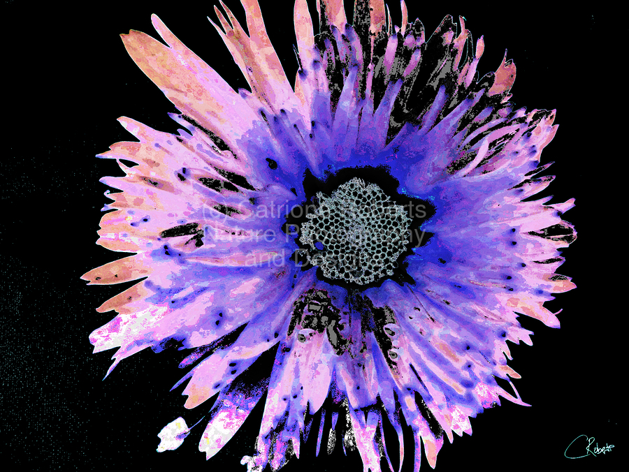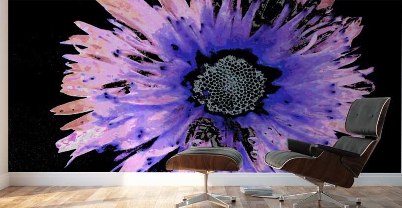 Originally a close up photo of a Daisy flower and a hand painted acrylic, laterally digitally manipulated and combined to create a stunning piece of contemporary floral art. Features a vibrant Daisy with dynamic, jagged petals spread across the canvas, varying in shades of purple and pink. The dark background enhances the striking contrasts and colors, drawing attention to the intricate details of the flower's center.