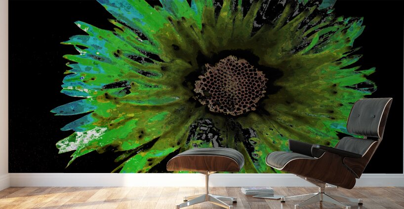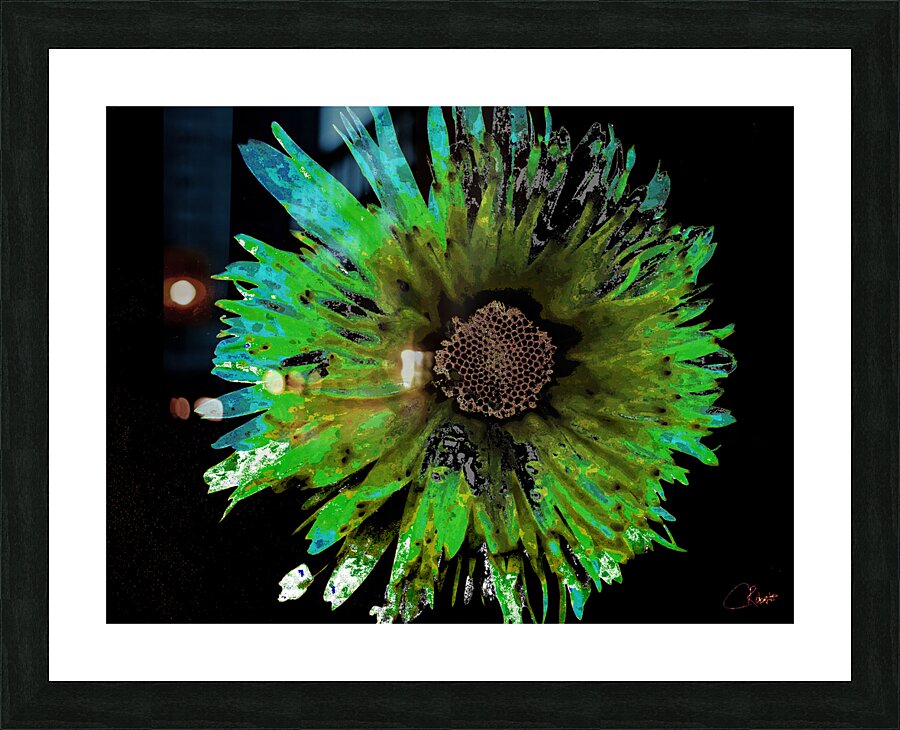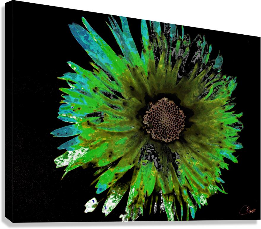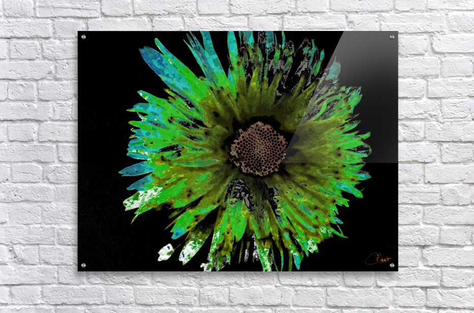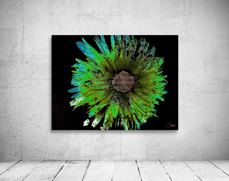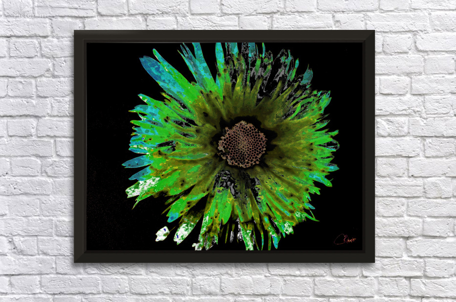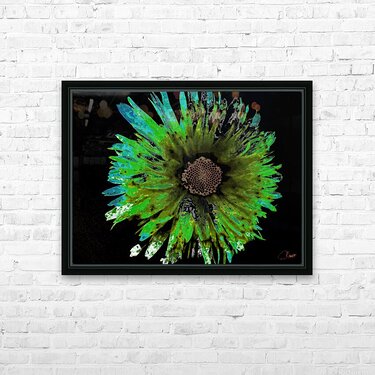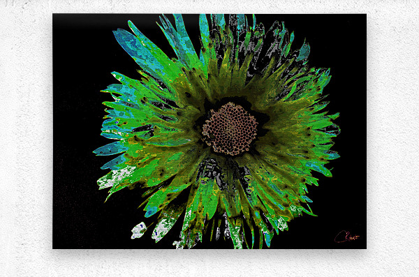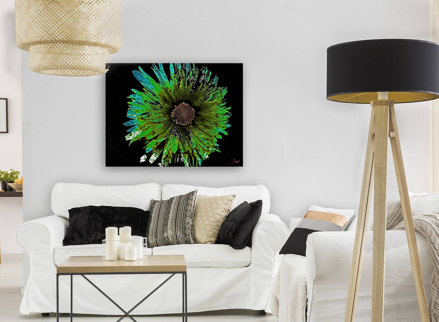 Originally a hand painted acrylic and a close up photo of a Daisy flower laterally digitally manipulated and combined to create a stunning piece of contemporary floral art. Features a vibrant Daisy with striking green and blue petals stands out against a dark background, drawing attention to its intricate center. The contrast emphasizes the dynamic energy in the plant's design.