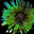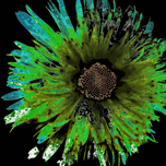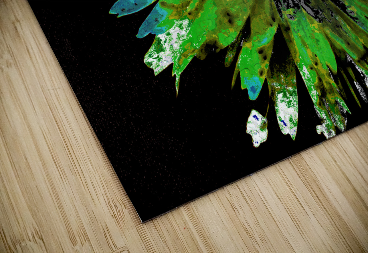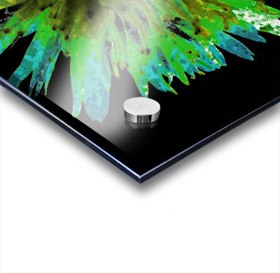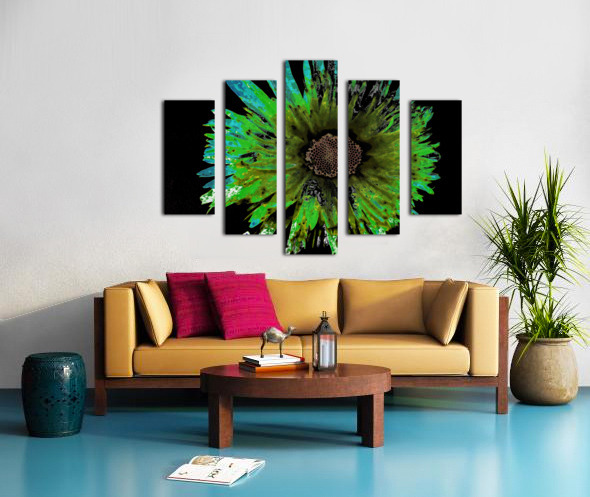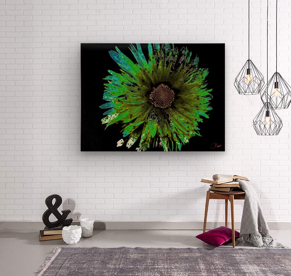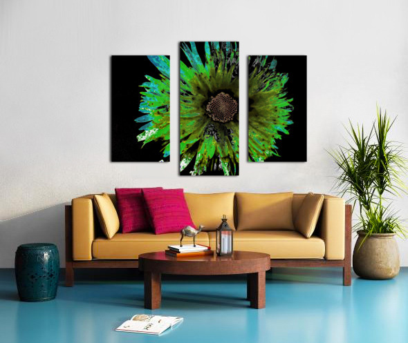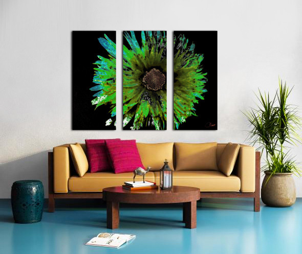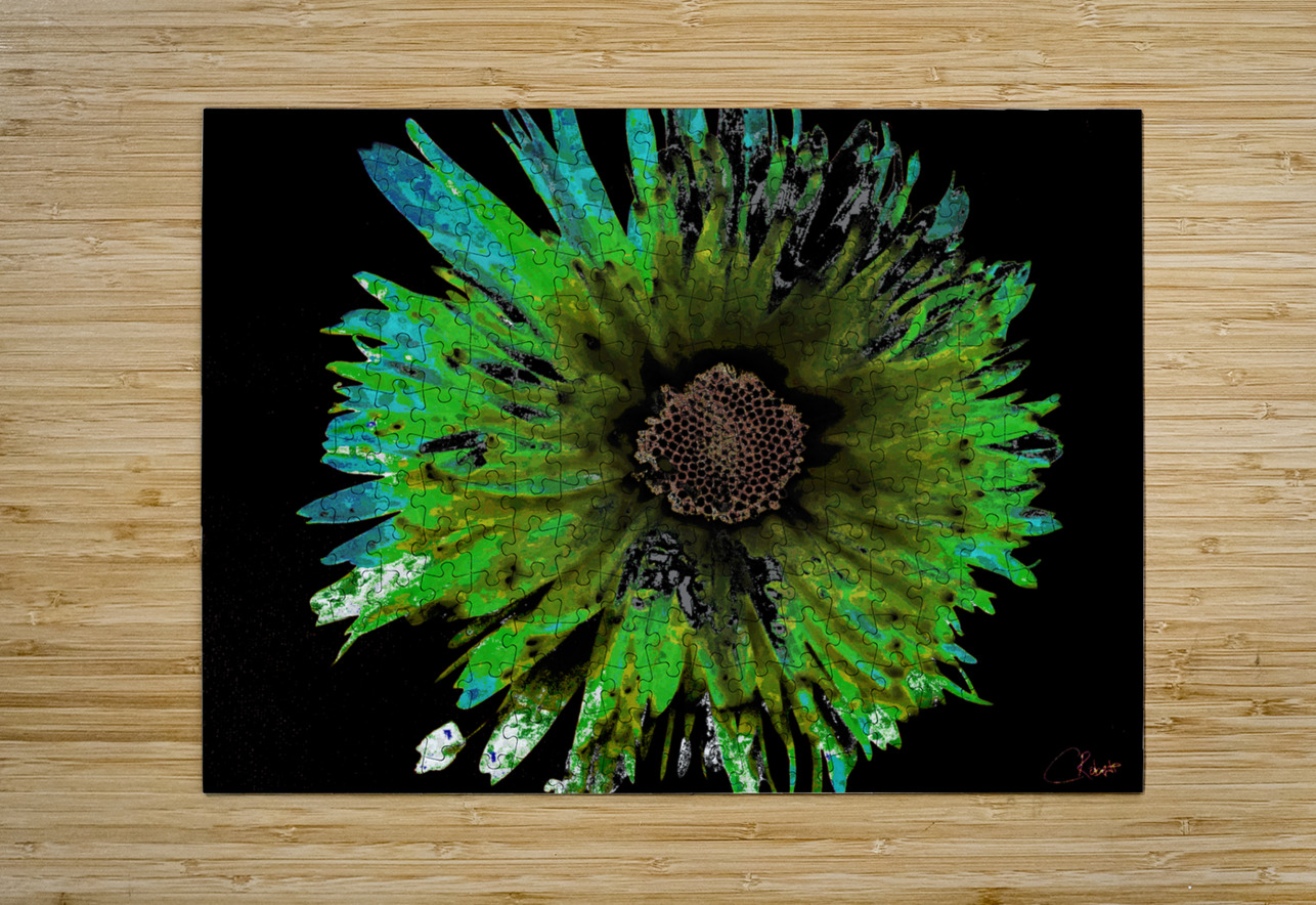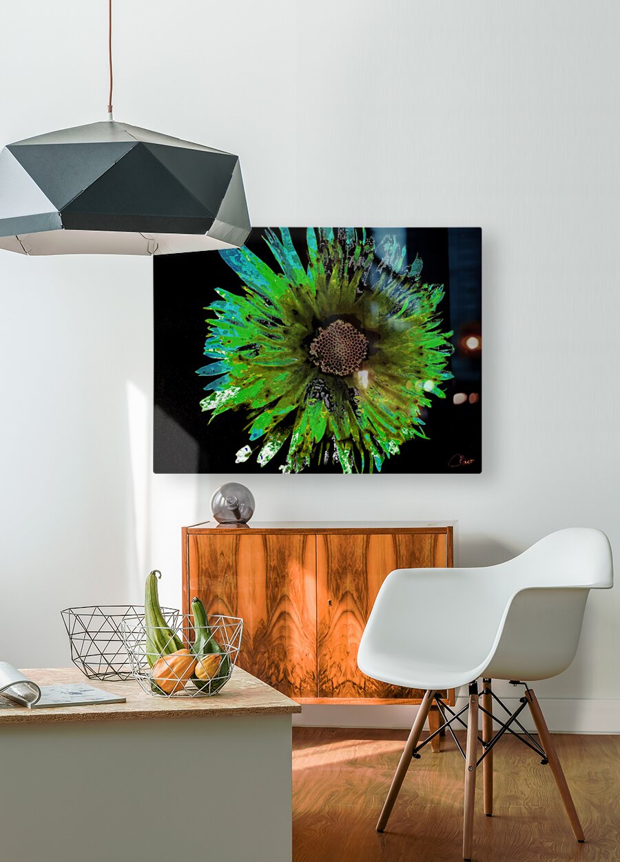 Originally a hand painted acrylic and a close up photo of a Daisy flower laterally digitally manipulated and combined to create a stunning piece of contemporary floral art. Features a vibrant Daisy with striking green and blue petals stands out against a dark background, drawing attention to its intricate center. The contrast emphasizes the dynamic energy in the plant's design.