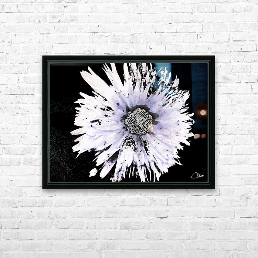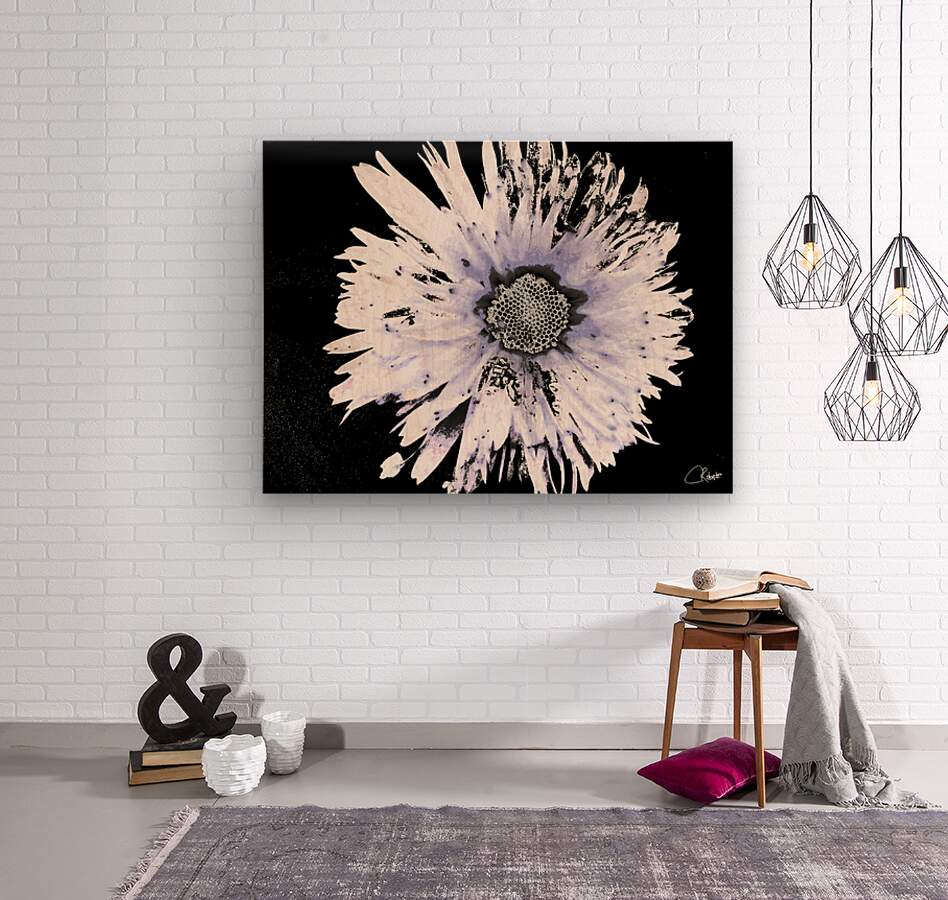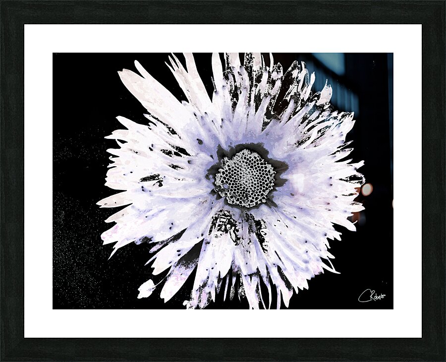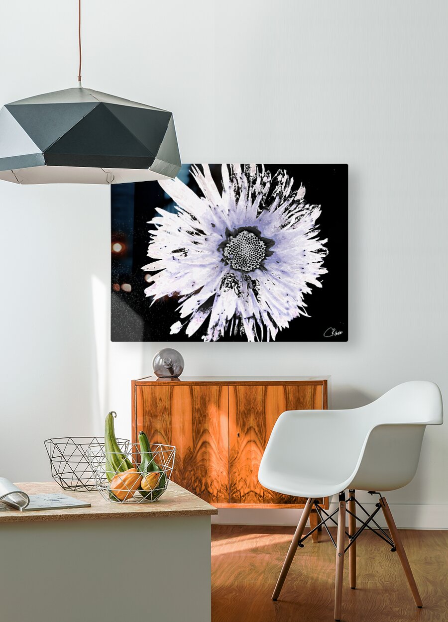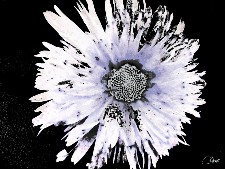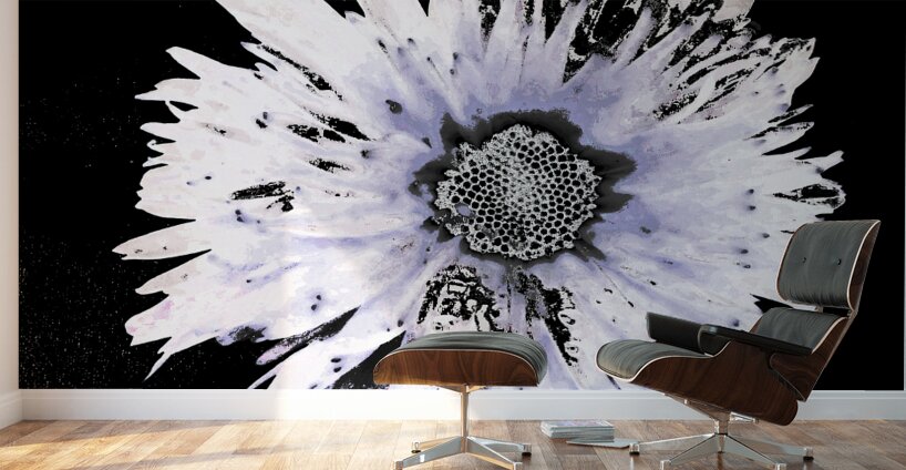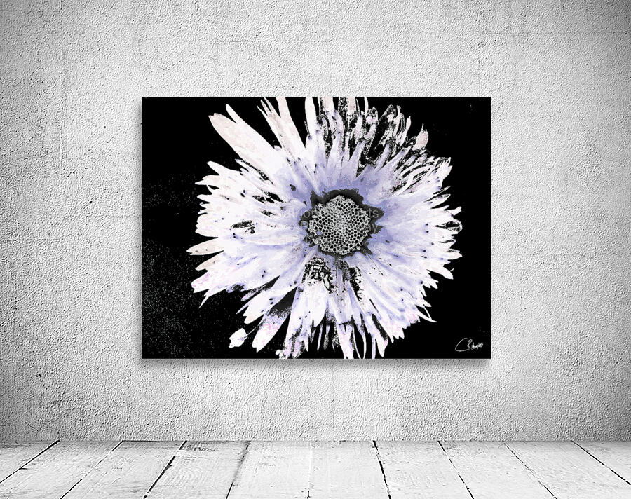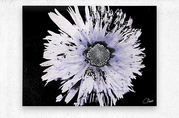 Originally a close up photo of a Daisy flower and a hand painted acrylic laterally digitally manipulated into a stunning piece of contemporary floral art. Features a large Daisy set against a dark background.