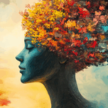 A woman is depicted in profile with a head made of colorful flowers and leaves blending into a bright sunset sky. The artwork conveys deep emotions an...[+]