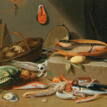 ABOUT THIS ARTWORK: A KITCHEN STILL LIFE WITH FISH. VEGETABLES AND A CAT BY PSEUDO JAN VAN KESSEL II