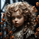 In a dimly lit room where shadows dance with whispers a figure emerges holding the gaze of those who dare to enter. She is a porcelain-skinned young girl her features delicate and ethereal as if spun from dreams. Her hair tumbles in cascades of rich golden curls framing a face that harbors the innocence of youth yet holds the weight of untold stories in her large expressive eyes. Surrounding her are wilted roses their muted tones of rust and sepia contrasting with her vibrant lively presence. These flowers reminiscent of past glories suggest a narrative of decay and beauty intertwined—perhaps a reflection of the fleeting nature of childhood or the bittersweet memories that linger in the heart. The roses seem to reach toward her as if she is a guardian of their secret lives embodying both fragility and resilience. Dressed in an intricately designed gown with playful ruffles and lace she stands as an embodiment of a bygone era yet her gaze pierces through time inviting exploration. With each detail—be it the folds of her attire or the delicate stem of the roses—the image beckons the viewer to ponder the stories captured within her quiet expression. This ethereal tableau hints at themes of nostalgia innocence and perhaps a sense of longing. The juxtaposition between the girls vitality and the decaying beauty of the roses creates a poignant reminder that while moments may fade they linger in memories inviting us to cherish the ephemeral beauty that life offers. In this intersection of light and shadow the girl stands as a silent witness to the passage of time evoking both melancholy and wonder.