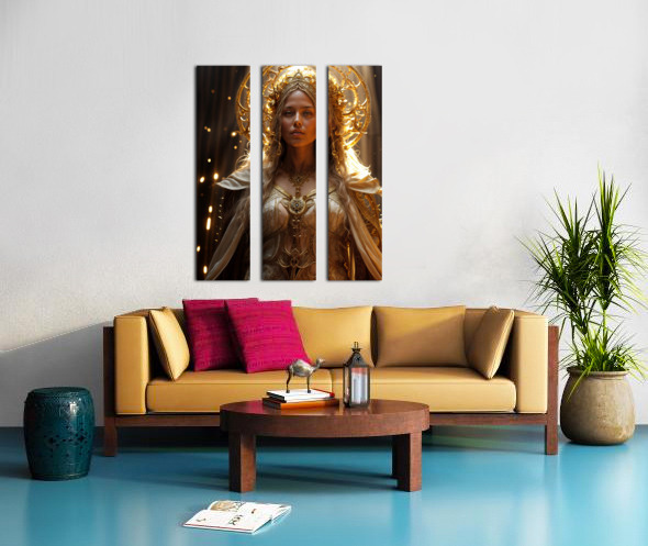 A woman with long blonde hair adorned in a golden crown and intricate ornate jewelry stands bathed in a warm ethereal light. Her piercing blue eyes ga...[+]