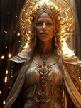 A woman with long blonde hair adorned in a golden crown and intricate ornate jewelry stands bathed in a warm ethereal light. Her piercing blue eyes gaze directly at the viewer conveying a sense of power and authority. She wears a flowing white robe intricately embroidered with golden threads and her delicate features are highlighted by the soft glow emanating from her surroundings. The image evokes a sense of otherworldly beauty and majesty suggesting a powerful and divine presence. The light and shadow interplay create a dramatic effect emphasizing the womans regal aura. The background blurred and filled with golden orbs further contributes to the mystical atmosphere.