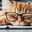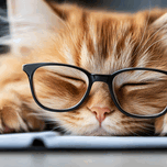 A fluffy orange cat with metal glasses frame is peacefully napping on a notebook. Its eyes are closed creating a serene atmosphere in a warm and invit...[+]