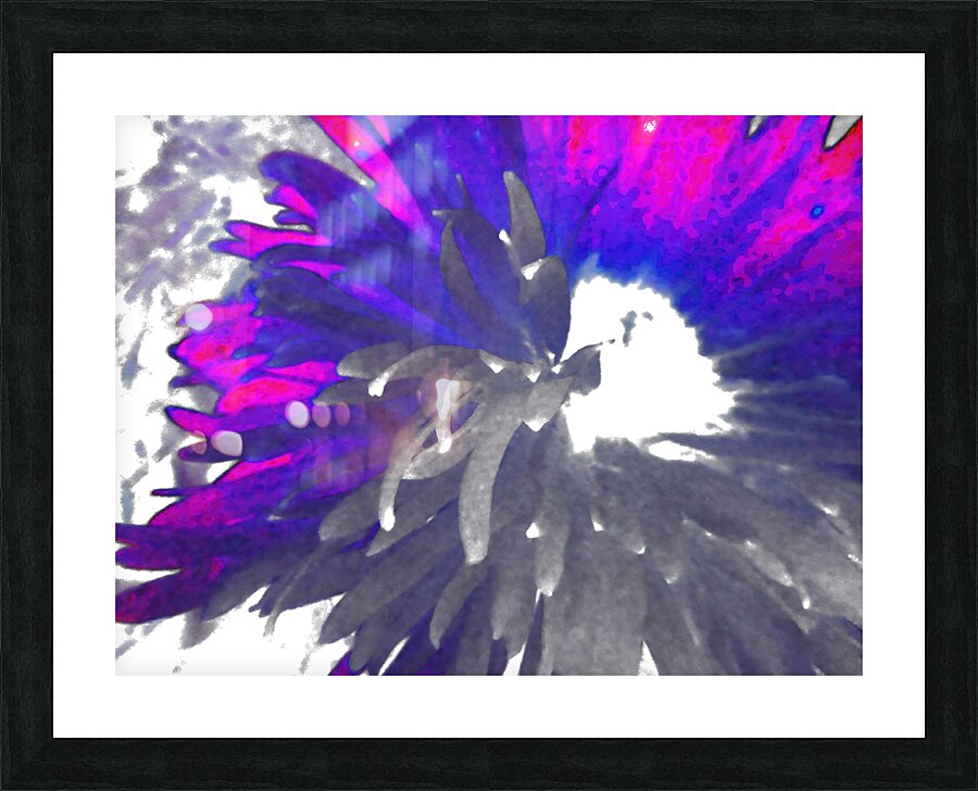 Originally a close up photo of a Daisy flower laterally digitally manipulated into a stunning piece of contemporary floral art. Features a vibrant abstract Daisy with petals in shades of purple and pink, radiating from a bright white center. The intricate blending of colors creates a dynamic and energetic feel.