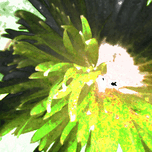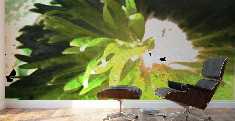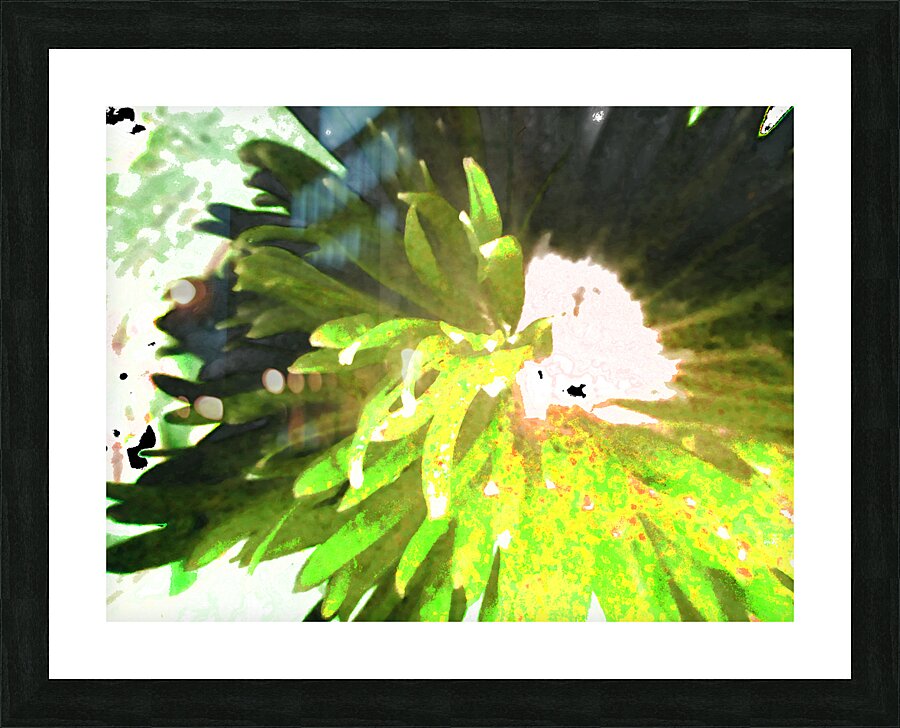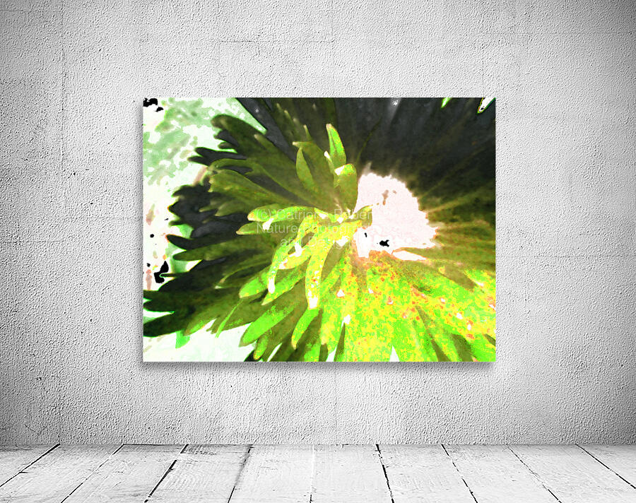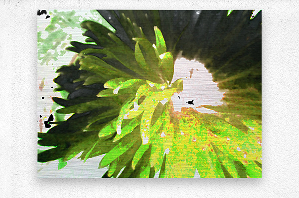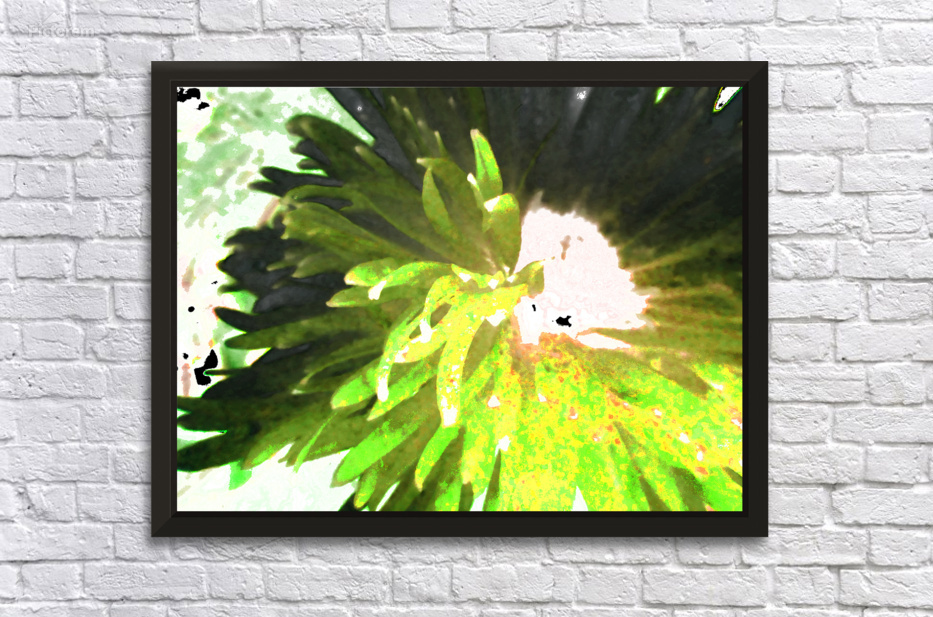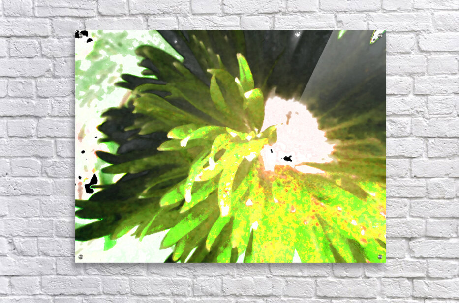 Originally a close up photo of a Daisy flower laterally digitally manipulated into a stunning piece of contemporary floral art (using colour options within GIMP). Features a vibrant splash of green which dominates the center, with spiky leaves radiating outward, creating a sense of dynamic movement. Soft and irregular shapes highlight the natural and organic Daisy, conveying a sense abstract petals.