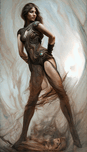 In a realm where the boundaries of nature and artifice intertwine a figure emerges commanding attention with a striking silhouette. Draped in an outfit that seems alive its swirling patterns resemble the intricate dance of vines caught in a gentle breeze. The ensemble clings to her form accentuating her strength and grace while evoking the essence of a mystical forest where the earthly and ethereal blend. Her posture is resolute a stance that speaks volumes of confidence and defiance against the winds that swirl around her. In one hand she holds a shimmering gem—a symbol of power and perhaps a key to ancient wisdom buried deep within her roots. The light catches the stone reflecting a myriad of colors that dance across her surroundings creating a halo of enchantment. The background awash with soft swirling hues carries an otherworldly quality as if it were painted by dreamers who sought to capture the fleeting essence of existence itself. It whispers of secrets held within the fabric of time beckoning the observer to delve deeper into the narrative of the figure before them. As she gazes outward a sense of purpose radiates from her inviting interpretations that weave through themes of strength resilience and an interconnectedness with nature. She stands not merely as a guardian of her domain but as a symbol of the harmony that can arise when one embraces both the wild and the crafted embodying a bridge between the tangible and the imagined.