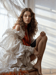 In a softly lit room where past and present coexist a young woman captures the essence of quiet contemplation. The gentle sunlight streams through a sheer curtain casting delicate patterns of light and shadow on the floor inviting a stillness that feels almost sacred. She sits in a moment suspended in time her expression a blend of introspection and vulnerability. Flowing fabric drapes around her an elegant white gown with its soft layers reminiscent of cloud formations wraps her in a cocoon of softness. Underneath a hint of something bold—a deep red top—peeks through symbolizing passion or perhaps a deeper inner strength waiting to be revealed. Her not-quite-posed posture conveys both a sense of grace and comfort one foot resting on the ground while the other is folded beneath her. The bare skin of her legs contrasts with the lavishness of her outfit emphasizing a balance between opulence and simplicity. The air around her seems thick with possibility as if she is on the brink of revealing a secret or embarking on a new journey. Each element—the texture of her clothing the play of light—contributes to a narrative filled with emotion and unspoken stories. In this space time feels irrelevant it is a moment that invites the beholder to ponder the layers of identity the clash of comfort versus extravagance and the quiet strength that can often go unnoticed. This serene tableau encourages reflection on the beauty found in both vulnerability and strength encouraging an understanding that we are all multifaceted beings navigating our own intricate paths.