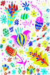 Originally a hand drawn doodle inspired design created using coloured ink pens and paper, laterally digitally manipulated to create a fun piece of contemporary floral art . Features colorful and vibrant florals as they fill the image, showcasing a diverse array of decorative flowers and leaves in bright hues. The mix of greens, pinks, blues, and reds creates a lively and cheerful pattern.