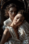 In a dimly lit timeless chamber two figures appear entwined in an ethereal embrace captured as if frozen in a delicate moment of intimacy. The soft glow of daylight filters through the space casting gentle shadows that dance across their faces highlighting the smooth contours and delicate features like brush strokes on a canvas. One woman her hair a cascade of loose waves gazes intently into the distance her expression a blend of contemplation and yearning while the other draped in elegant fabrics that shimmer like the finest silk leans back eyes softly closed embodying tranquility. Their bodies seem to communicate silently as if sharing secrets known only to them reflecting a bond that transcends words. The ornate mirror behind them frames this moment adding a layer of dimension and depth as if the reflection holds otherworldly memories and future aspirations. The luxurious fabrics they wear contribute to a narrative of grace and beauty suggesting a story not just of connection but also of vulnerability and strength. Together they represent the duality of existence—where one seeks and questions and the other simply is offering comfort in stillness. The atmosphere brims with an unspoken promise leaving the viewer to ponder the intricate layers of love identity and the essence of shared experience within this enchanting tableau.