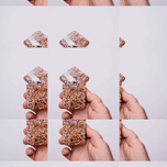 A hand holding a seed snack in a repetitive mirrored pattern symbolizing food design nutrition and creative abstract photography