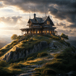 High atop a rugged hill where the earth meets the sky stands an ancient house proud and solitary. The sun dips low casting a warm golden hue that dances upon the weathered stones of its facade. This house with its quaint yet grand architecture hints at stories long forgotten. Its spires pierce the heavens like fingers reaching for something elusive while the gabled roof adorned with intricate details suggests a craftsmanship of an era when artistry was paramount. Shadows cast by the rapidly moving clouds stretch across its body giving it an aura both mysterious and inviting. Around the base tufts of grass flourish undeterred by the rockiness of their surroundings thriving in the freedom of the wild. The winding path—barely discernible—meanders up to the entrance inviting wanderers to discover what lies within. Each stone along this path whispers tales of travelers who have come before their laughter and whispers intertwining with the rustle of leaves in the cool evening air. As night begins to encroach the windows glow with a soft welcoming light as if the house itself breathes warmth into the chilly dusk. There’s a feeling of history embedded within these walls—a blend of joy and sorrow that seeps into the very air resonating with the echoes of lives once lived. This house perched on its solitary cliff could symbolize resilience and solitude embodying the balance of beauty and isolation. Its presence—both haunting and alluring—serves as a reminder of the countless stories it holds and the new ones waiting to unfold. Here nature and humanity coexist making every moment feel timeless in the twilight.