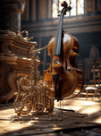 A cello and a saxophone rest on a wooden floor bathed in warm sunlight. The cello with its rich brown varnish and intricate details stands tall its strings gleaming in the light. The saxophone with its golden sheen and intricate curves lies on its side its bell facing the viewer. The instruments are positioned against a backdrop of ornate wooden furniture creating a sense of grandeur and elegance. The image evokes a feeling of beauty artistry and the power of music. The interplay of light and shadow adds depth and dimension to the scene highlighting the beauty of the instruments and the craftsmanship that went into their making. The overall effect is one of tranquility and contemplation inviting the viewer to appreciate the artistry and craftsmanship of these musical treasures.