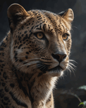 A close-up portrait of a leopard showcasing its distinctive spotted fur and piercing yellow eyes. The background is softly blurred emphasizing the leopards features.